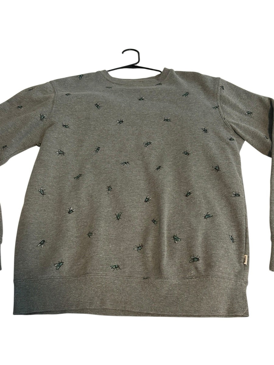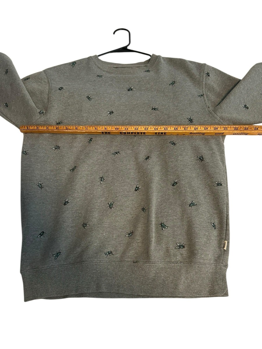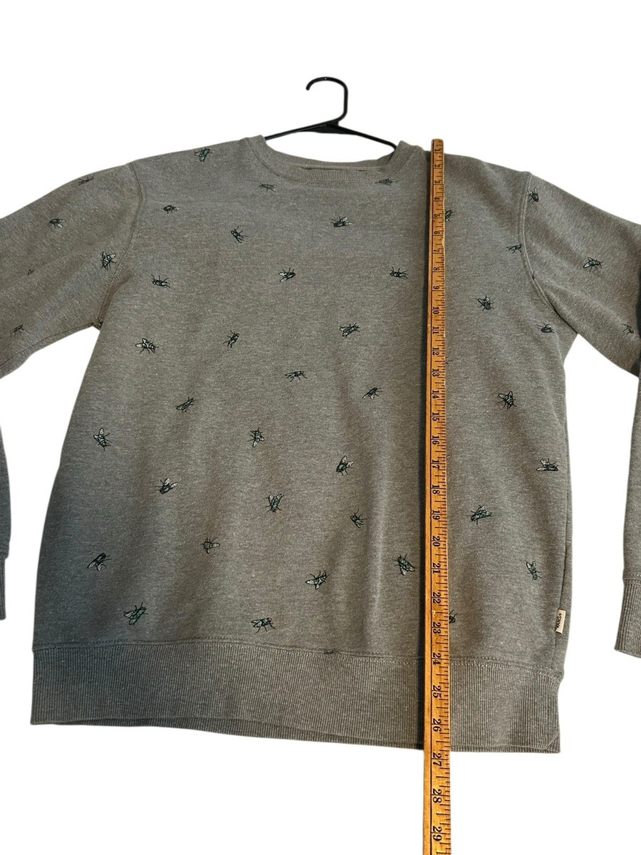 The Vans Sweatshirt for men in size medium features a crewneck pullover style with a unique all-over print of a fly motif. Made from a comfortable cotton blend material, this gray sweatshirt is adorned with embroidered accents and a graphic print design. Perfect for all seasons, this pullover sweatshirt is ideal for winter, fall, and spring, adding a touch of colorful and classic style to any wardrobe.