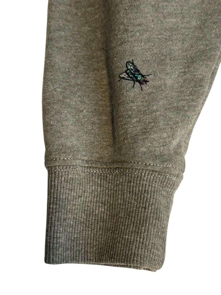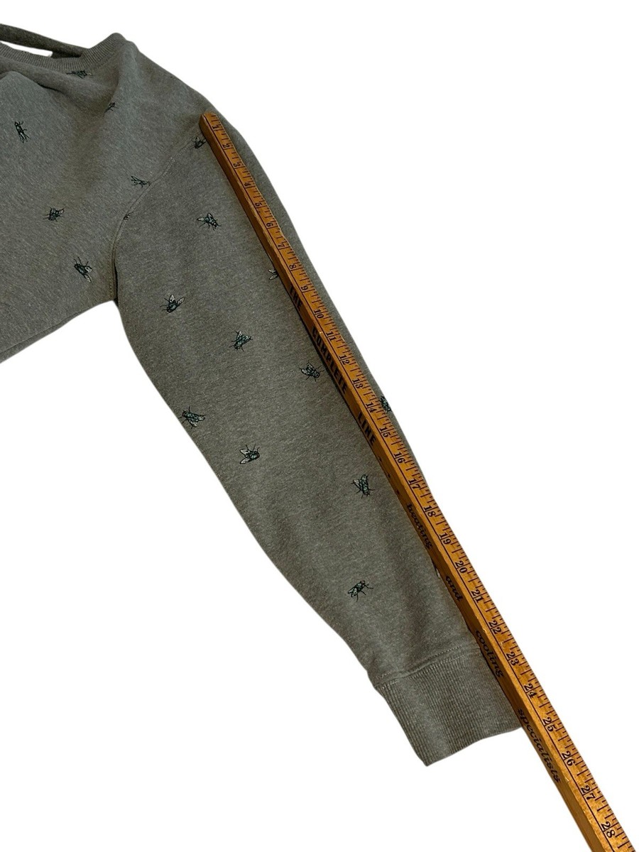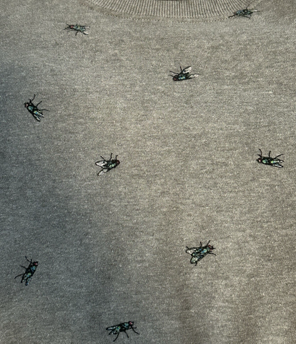 The Vans Sweatshirt for men in size medium features a crewneck pullover style with a unique all-over print of a fly motif. Made from a comfortable cotton blend material, this gray sweatshirt is adorned with embroidered accents and a graphic print design. Perfect for all seasons, this pullover sweatshirt is ideal for winter, fall, and spring, adding a touch of colorful and classic style to any wardrobe.