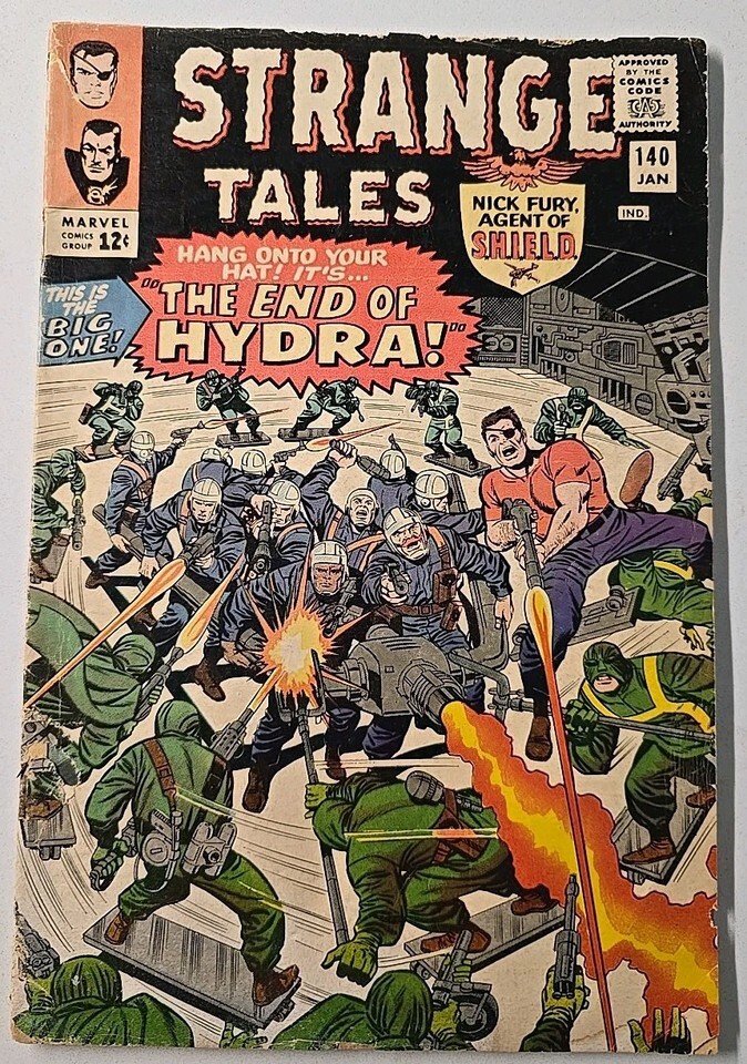 The product is "Strange Tales #140" published by Marvel Comics in January 1966 during the Silver Age era. This comic features characters such as Nick Fury, Doctor Strange, Hydra, and Iron Man (Tony Stark) within the genres of superheroes, espionage, and fantasy. The issue was written and illustrated by iconic creators like Stan Lee, Steve Ditko, and Jack Kirby, showcasing their contributions to US Comics during that period.