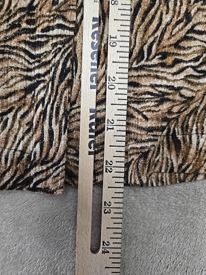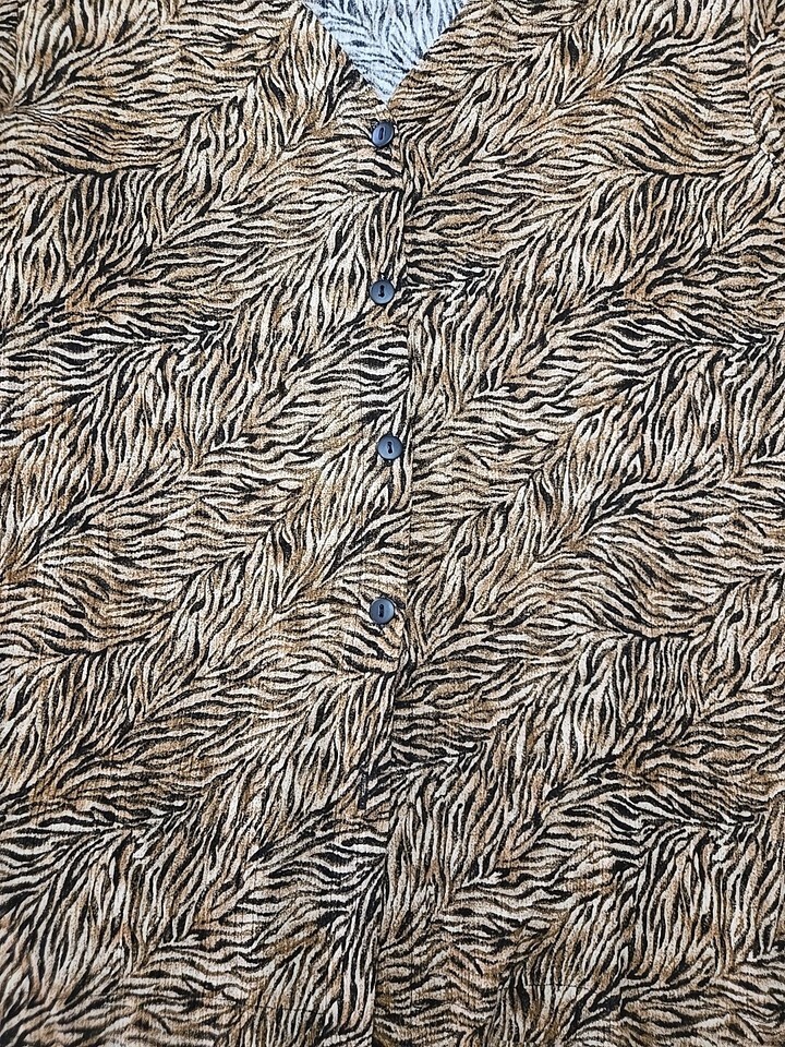 This vintage Pendleton button-up shirt is a must-have for any fashion-forward woman. The long sleeves and V-neckline make it perfect for the cooler seasons, while the lightweight rayon material keeps you comfortable all year round. The brown and black animal print pattern adds a touch of designer style to your wardrobe, and the shirt is perfect for both travel and casual occasions.