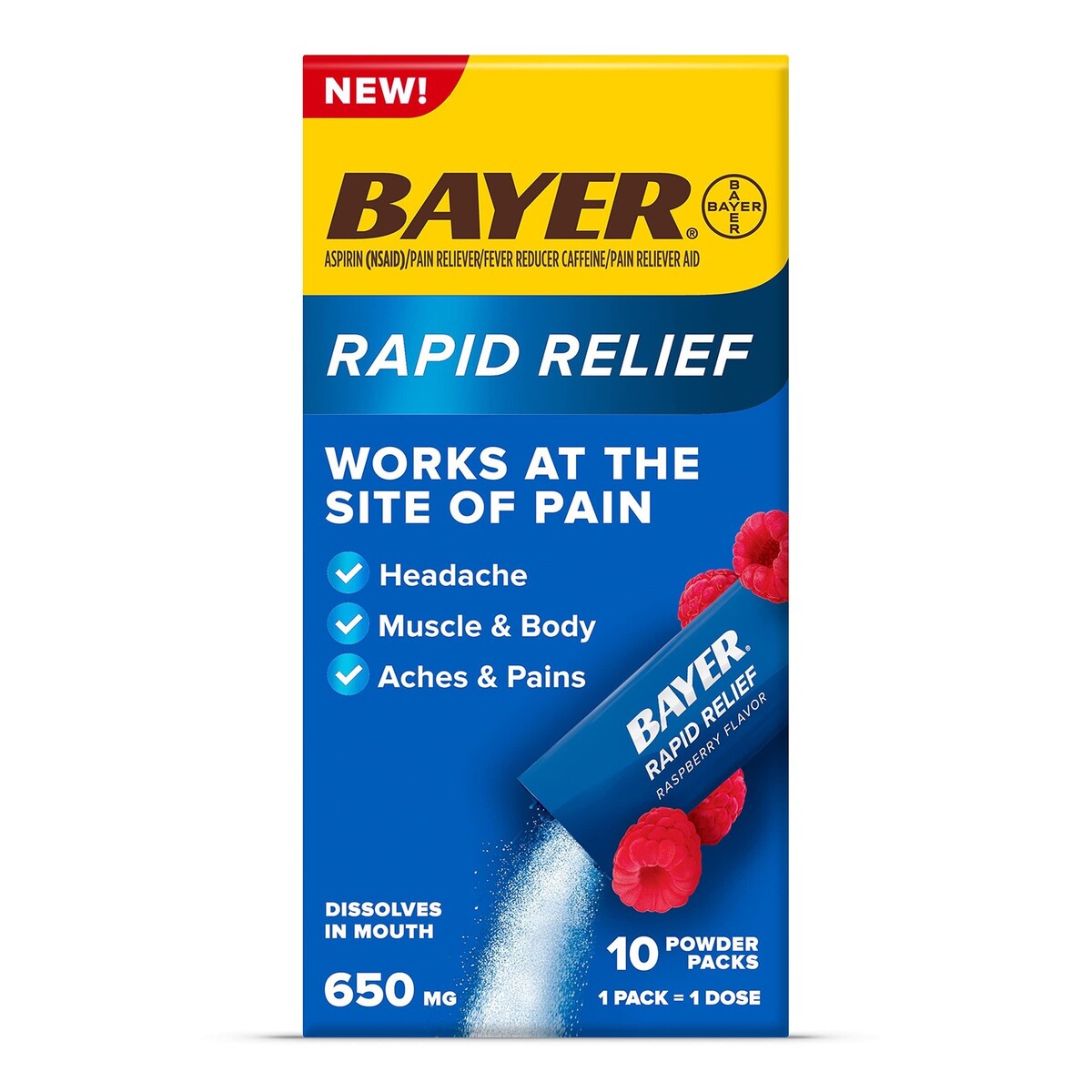 9 Boxes with 10 in each box Dated 8/2025 ? DISSOLVABLE FAST PAIN RELIEF: NEW Bayer Rapid Relief provides pain relief at the tip of your tongue. A single Bayer Rapid Relief powdered aspirin pack provides rapid pain relief that gets to work as hard as you do ? WORKS AT THE SITE OF PAIN: With active ingredients aspirin and caffeine, Bayer Rapid Relief works at the site of pain to relieve headache pain, muscle pain, back pain, menstrual cramps, minor arthritis pain, and helps to reduce fever ? RIP IT, TIP IT, RELIEF: To use, simply shake contents of individual pack, tear at the arrow, pour the powder on your tongue, and follow with water ? GREAT TASTE: Bayer Rapid Relief powder packs provide on the go pain relief with a great taste ? FROM THE ORIGINAL ASPIRIN BRAND: Bayer Aspirin provides fast pain relief for headaches and back and body pain Use as directed