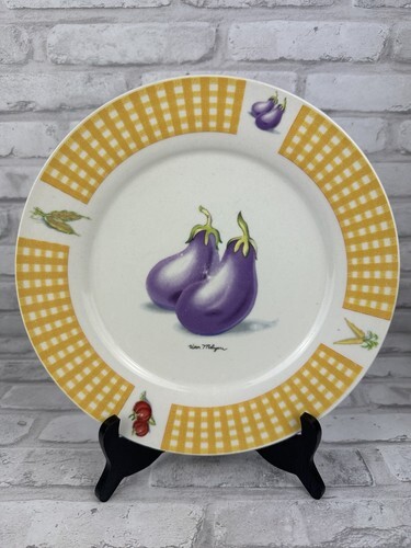 Tabletops Unlimited Fresh Vegetable Dinner Plate 10.75" Eggplant Yellow Checked