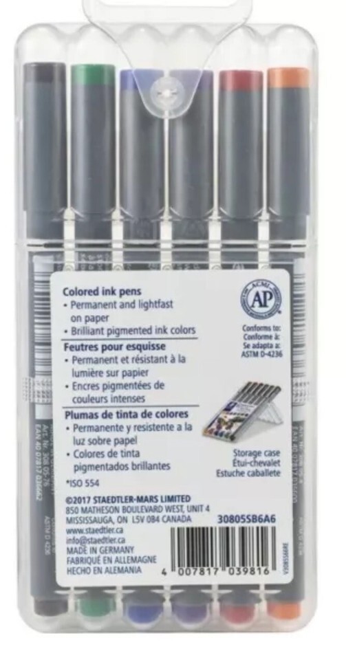 Enhance your art and design experience with these Staedtler Pigment Liners. The 0.5mm liners come in a pack of six with assorted colors to choose from. Made in Germany, these liners are perfect for creating detailed lines and strokes without worrying about ink bleeds.