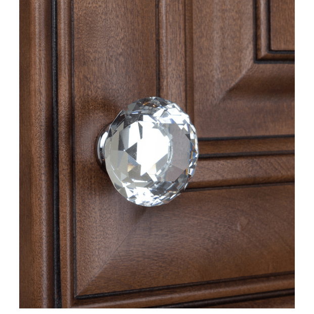 Upgrade your cabinets with this 10-pack of K9 Crystal cabinet knobs. Each knob is individually packaged to prevent damage to the finish. 1-inch and 1-3/8-inch installation screws are included. Please note - there is also a removable protective wrap around each knob. Diameter: 1-5/8 inches - Projection: 1-1/4 inches - Finish: Clear with Polished Chrome Base