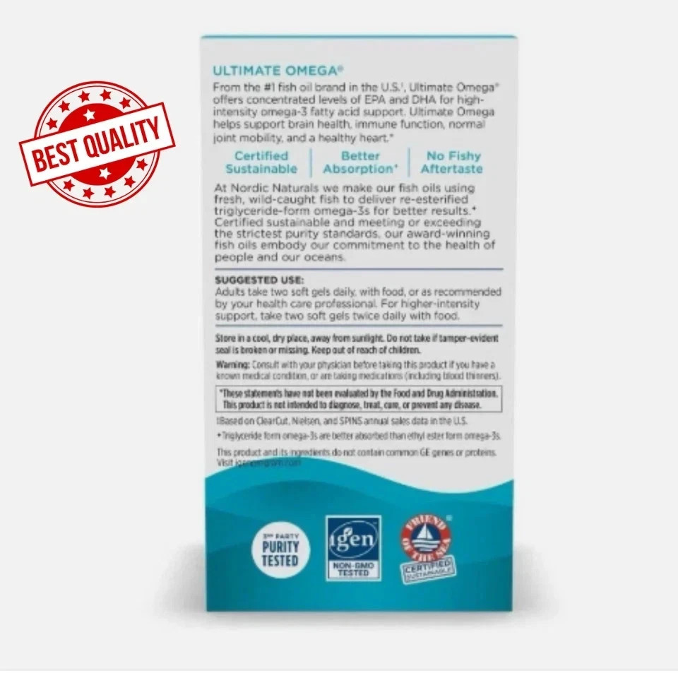 Ultimate Omega is a high-potency fish oil supplement formulated to provide a concentrated dose of the omega-3 fatty acids EPA and DHA. According to Nordic Naturals, this formula is designed for individuals seeking enhanced support for heart, brain, and joint health, as well as general wellness.
