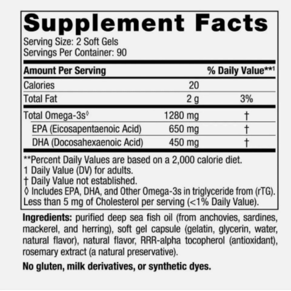 High concentration of omega-3s: Each typical serving (2 softgels) provides ~1,280 mg total omega-3s, including ~650 mg EPA and ~450 mg DHA, plus about 180 mg other omega-3s.
