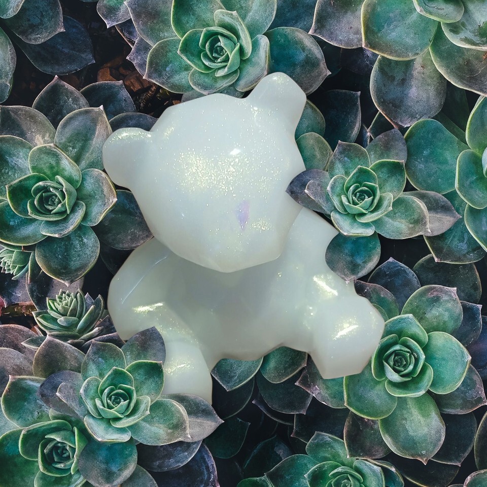 This is a small, faceted 3D bear done in a holographic resin to simulate the look of the traditional Birthstone Opal for October.