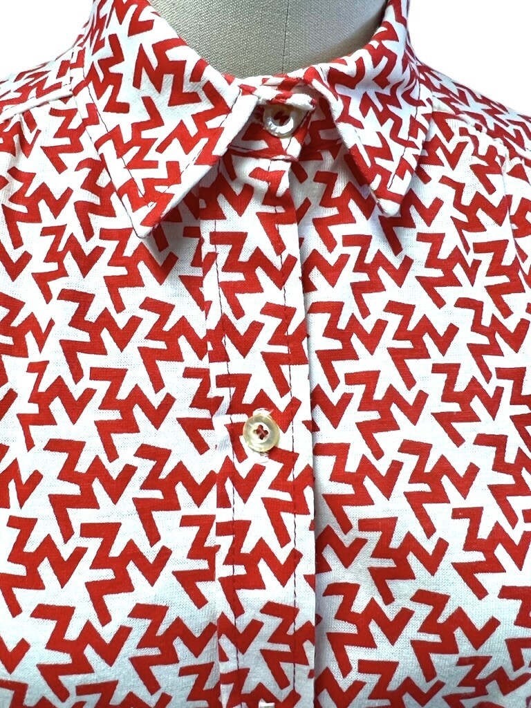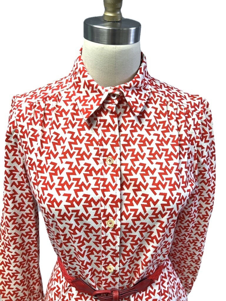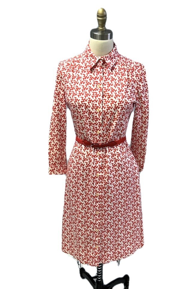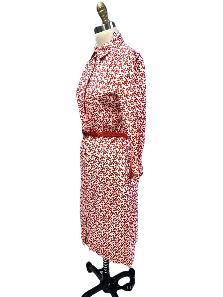 Vintage 1970s Tanner cotton knit shirt dress, marked size 8 (bust 38?, waist 36?), in a bold red and white ?ZZZ?s? print that creates a striking optical effect. Designed with a full button front, long sleeves with cuffs, side seam pockets, and a braided red belt for shaping.