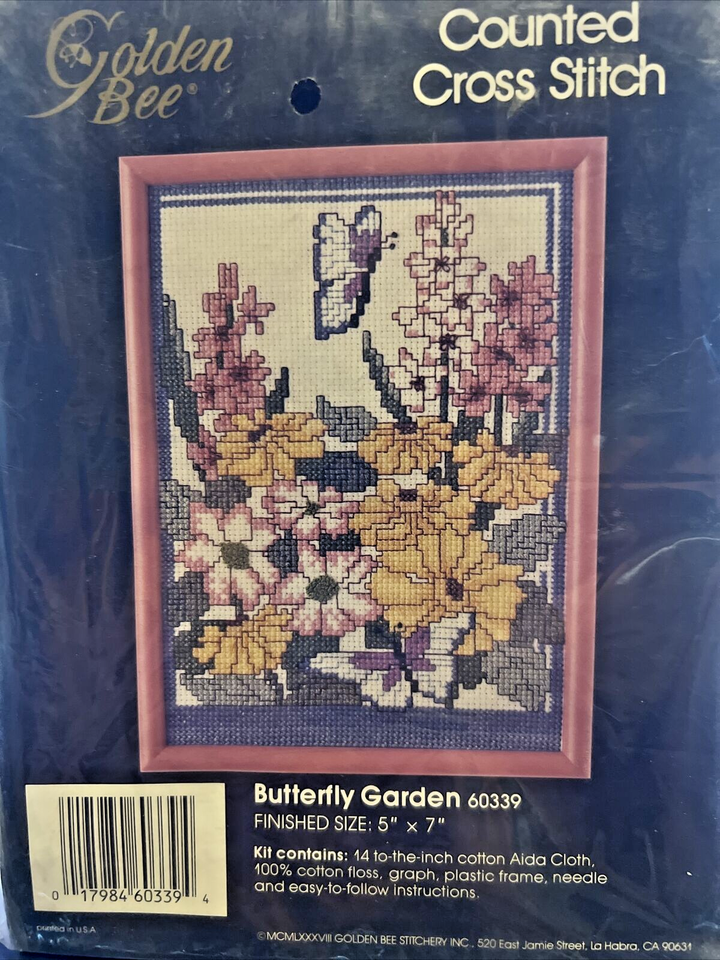 This 1988 Golden Bee Counted Cross Stitch Kit # 60339 "Butterfly Garden" is a beautiful addition to your cross stitch collection. The kit includes everything you need to create a stunning framed picture of a butterfly garden, with a 3D effect that adds depth to the design. The kit features fabric/cloth bundled with a frame, making it easy to get started on your project.