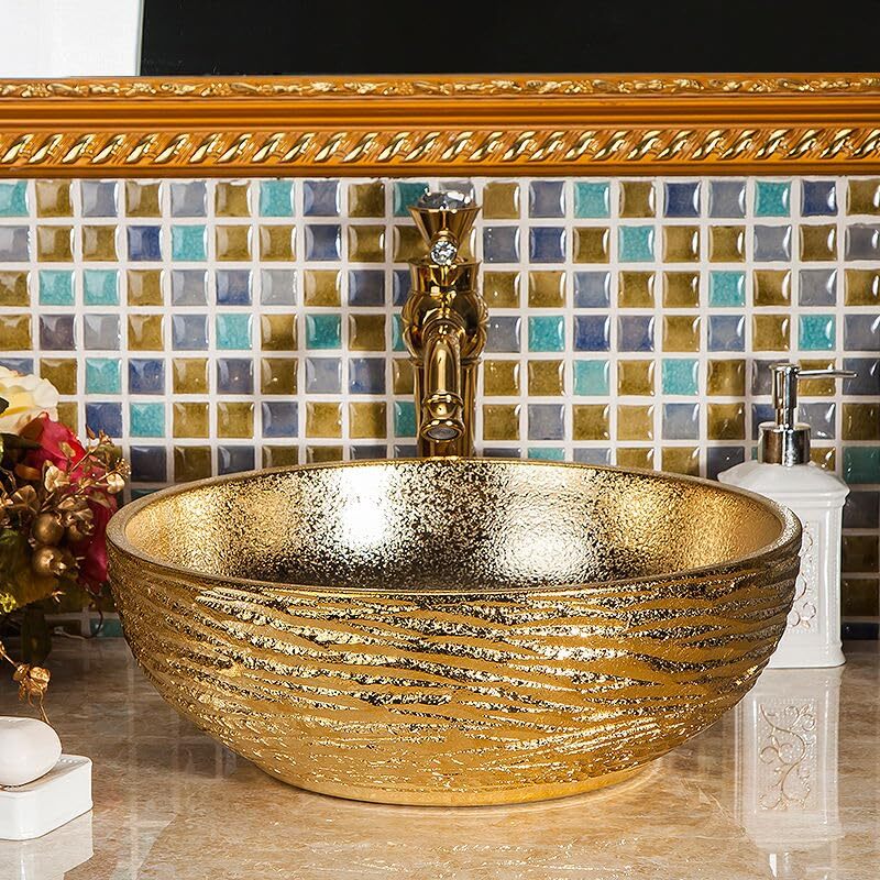 Product description: Elevate your bathroom's aesthetic with this exquisite handcrafted gold porcelain vessel basin by Interoknack. The luxurious sink features a distinctive textured exterior with horizontal band patterns that create a stunning visual impact, while the radiant interior finish captures and reflects light beautifully. Measuring 16.2 inches in diameter with a generous 5.9-inch height, this spacious round basin provides ample room for daily use while making a bold design statement. The premium porcelain construction ensures durability, scratch resistance, and effortless maintenance, with a high-gloss finish that maintains its brilliance over time. Designed for above-counter installation and compatible with standard 1.77-inch drain fittings (sold separately), this artistic lavabo sink serves as the perfect centerpiece for modern luxury bathrooms, upscale vanity spaces, or boutique hotels seeking to create an atmosphere of sophisticated elegance.