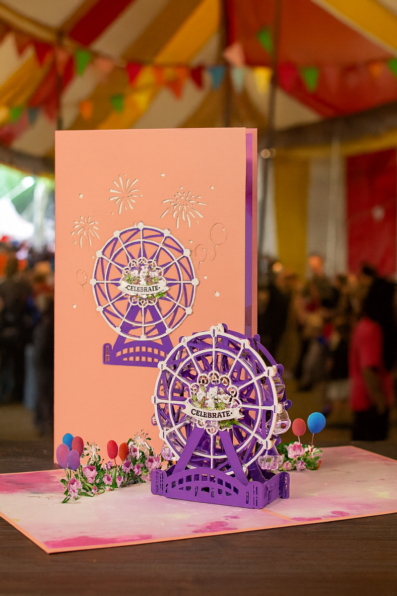 Ferris wheel pop-up greeting card, comes complete with an envelope and is cellophane wrapped