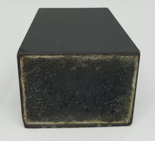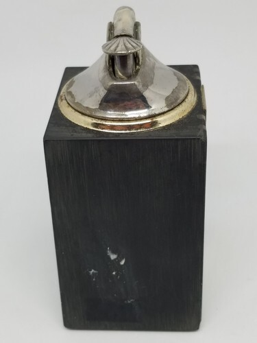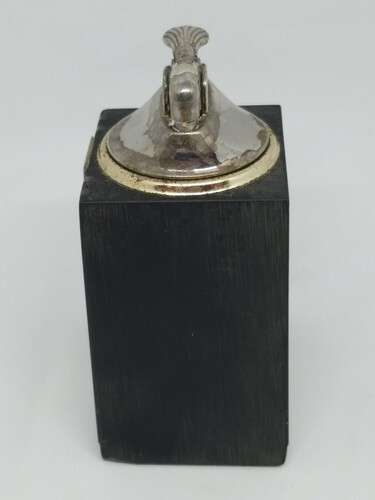 In vendita e un accendino in pietra Reed e Barton Black con linee in argento sterling intarsiate e applicate. L'accendino ha scheggiature sugli angoli inferiori, vedi foto e misura 2,5 x 2 pollici alla base. L'accendino e alto 4 pollici.