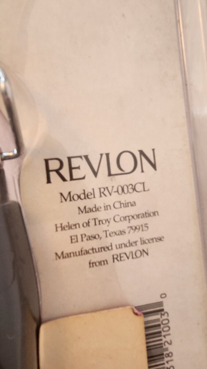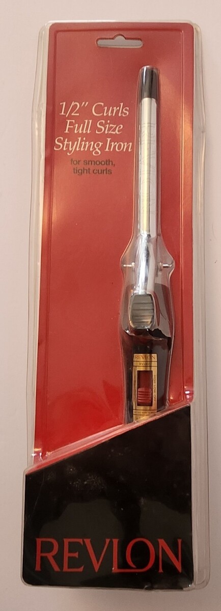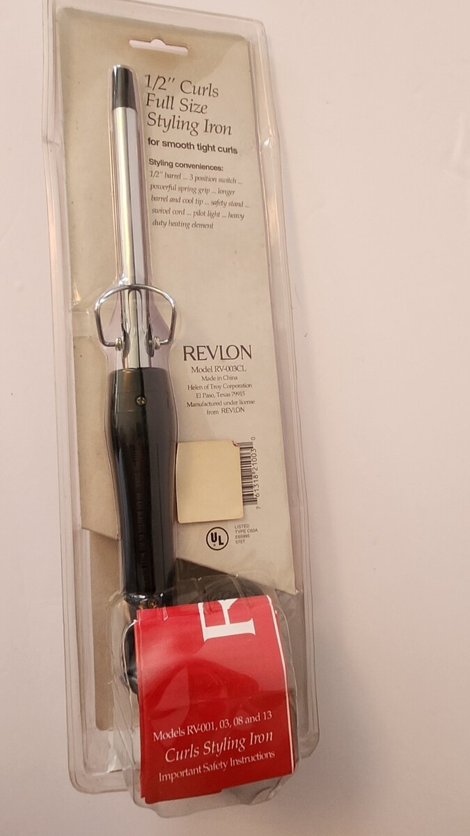 The item in the image is a Revlon 1/2" Curls Full Size Styling Iron, model number RV-003CL. It is a vintage or older model curling iron designed to create smooth, tight curls.