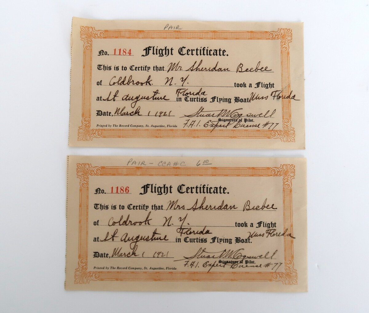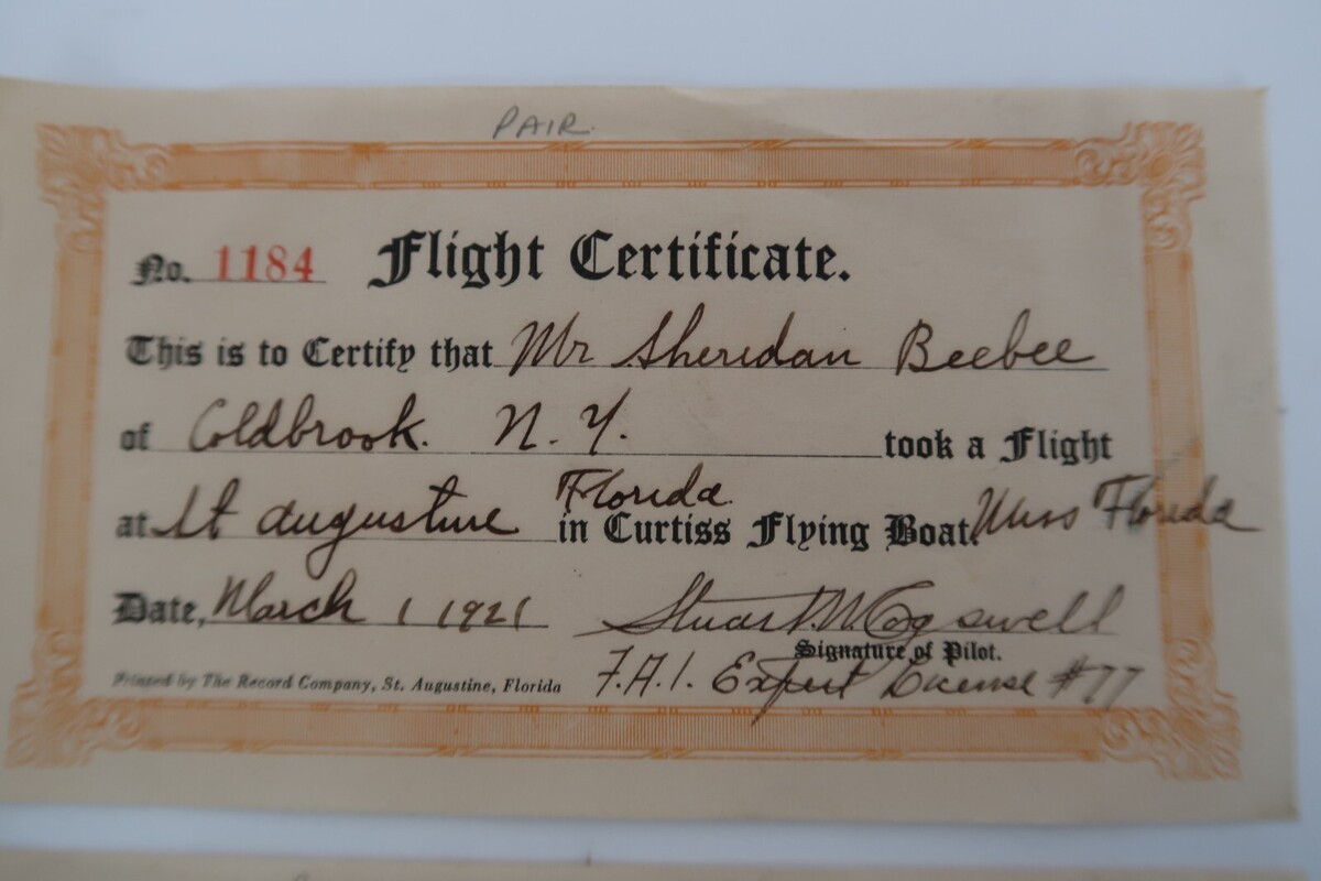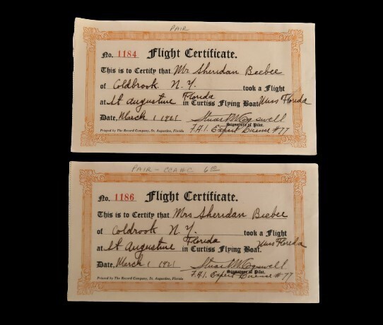 Two autographed certificates by Expert Pilot Stuart Cogswell, a Curtiss Airplane Test Pilot, a US Army Aircorps Trainer WW1, a private pilot for Harold Vanderbilt, President and General Manager of Aero Service Company. Very unique antique ephemera.
