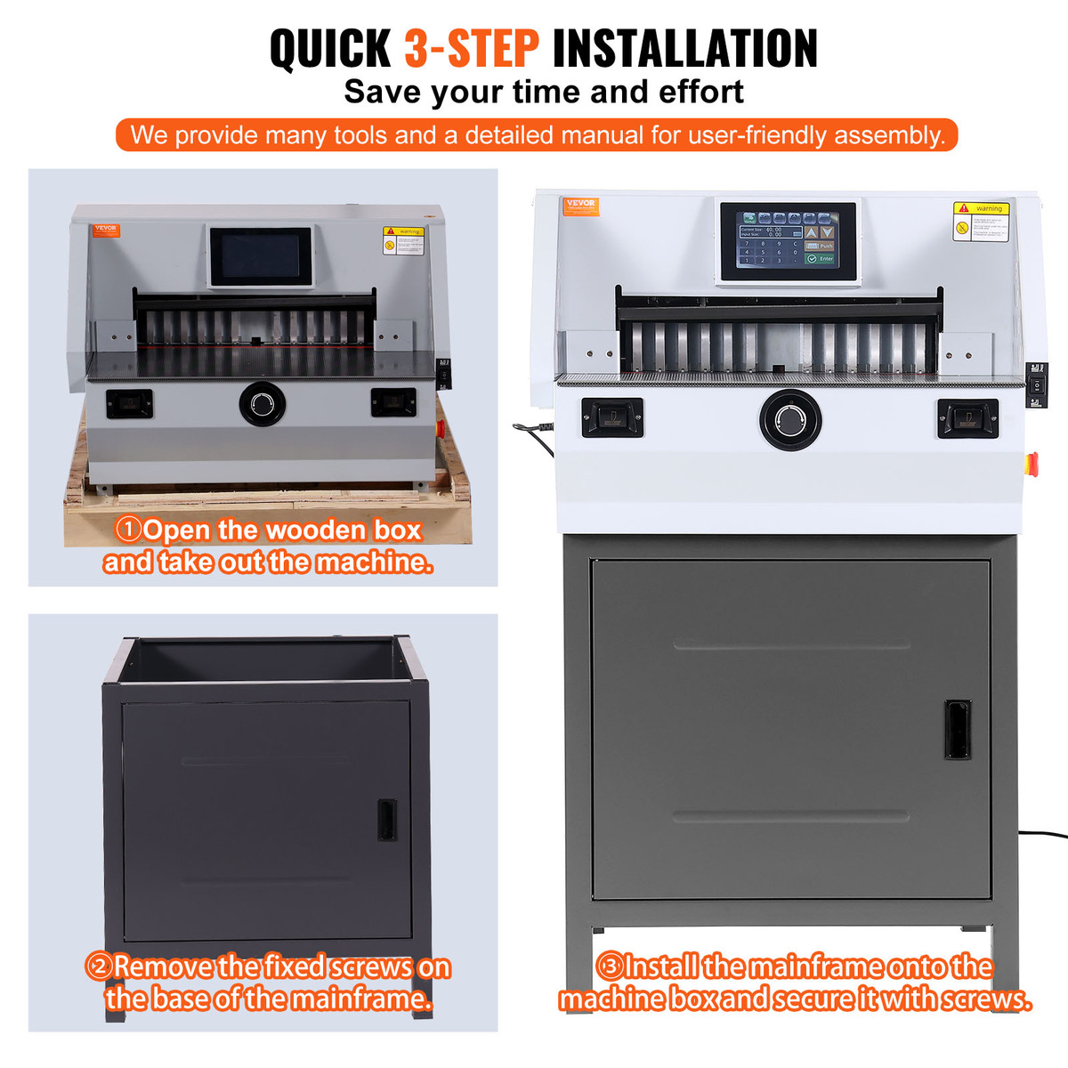 Quick Installation: Comprehensive tools and detailed instructions are provided for easy assembly and operation. Install our cutting paper machine in a flat, spacious area. Open the wooden crate, remove the machine case, detach the fixed screws on the mainframe's base, attach the mainframe to the case, and secure it with screws. Ensure ample personnel due to the machine's weight.