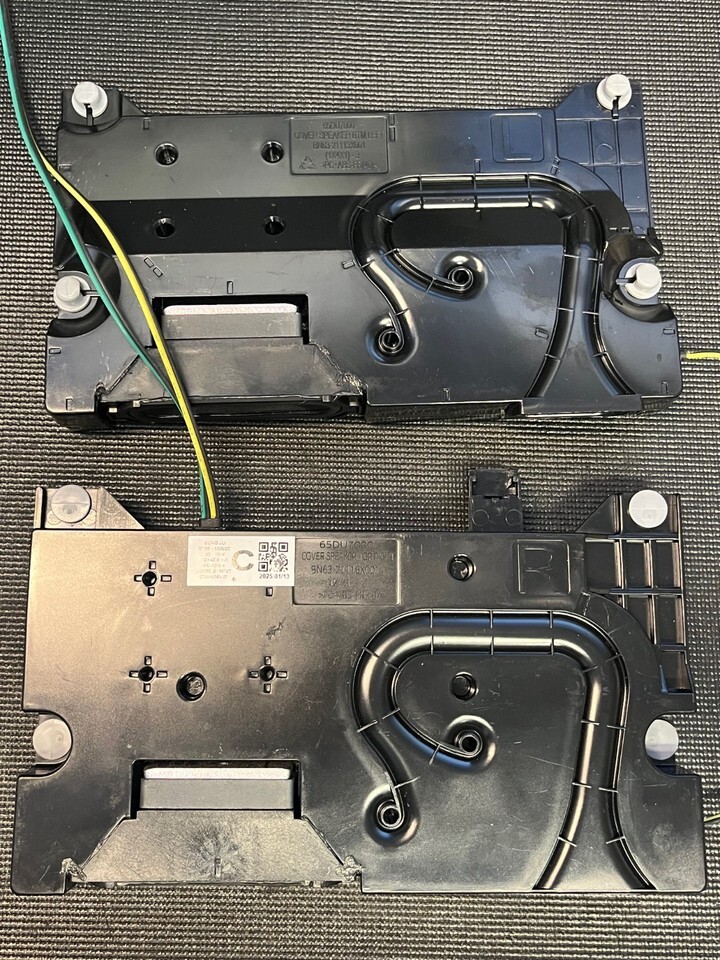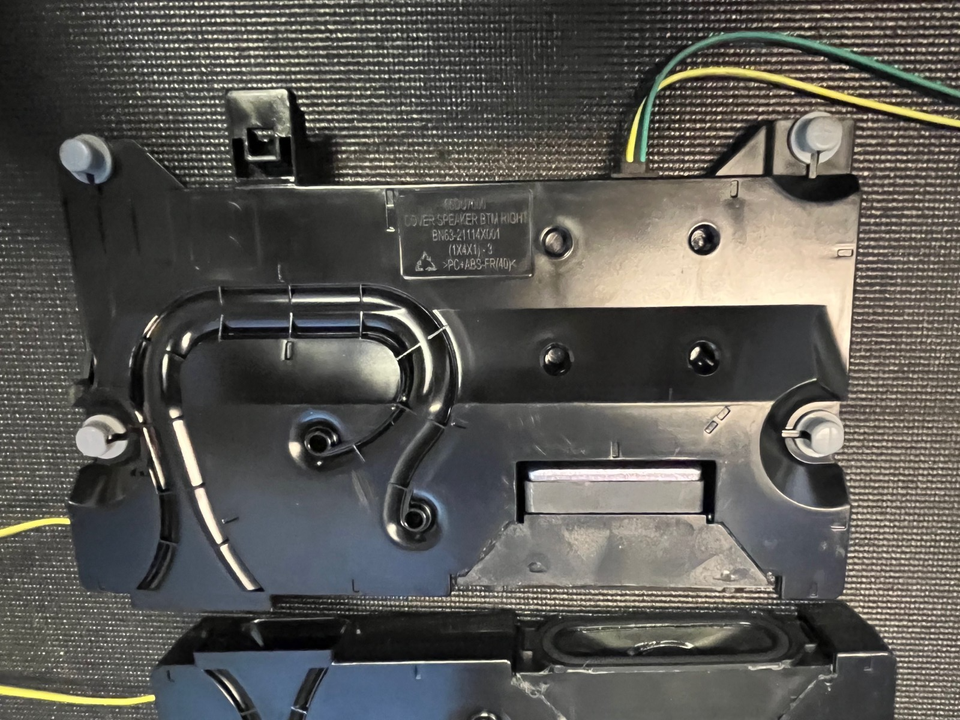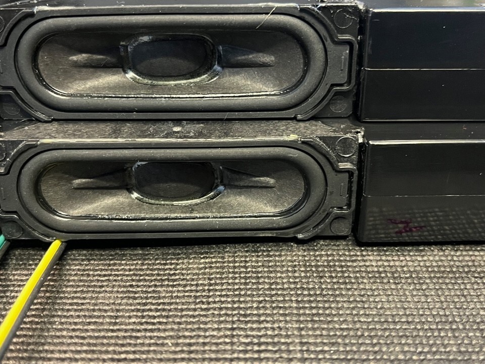 The speakers are used and untested, with typical signs of previous installation, making them ideal as replacement parts for repair technicians or DIYers working on compatible Samsung TV models. Their OEM construction ensures optimal fit and performance if tested and reused.