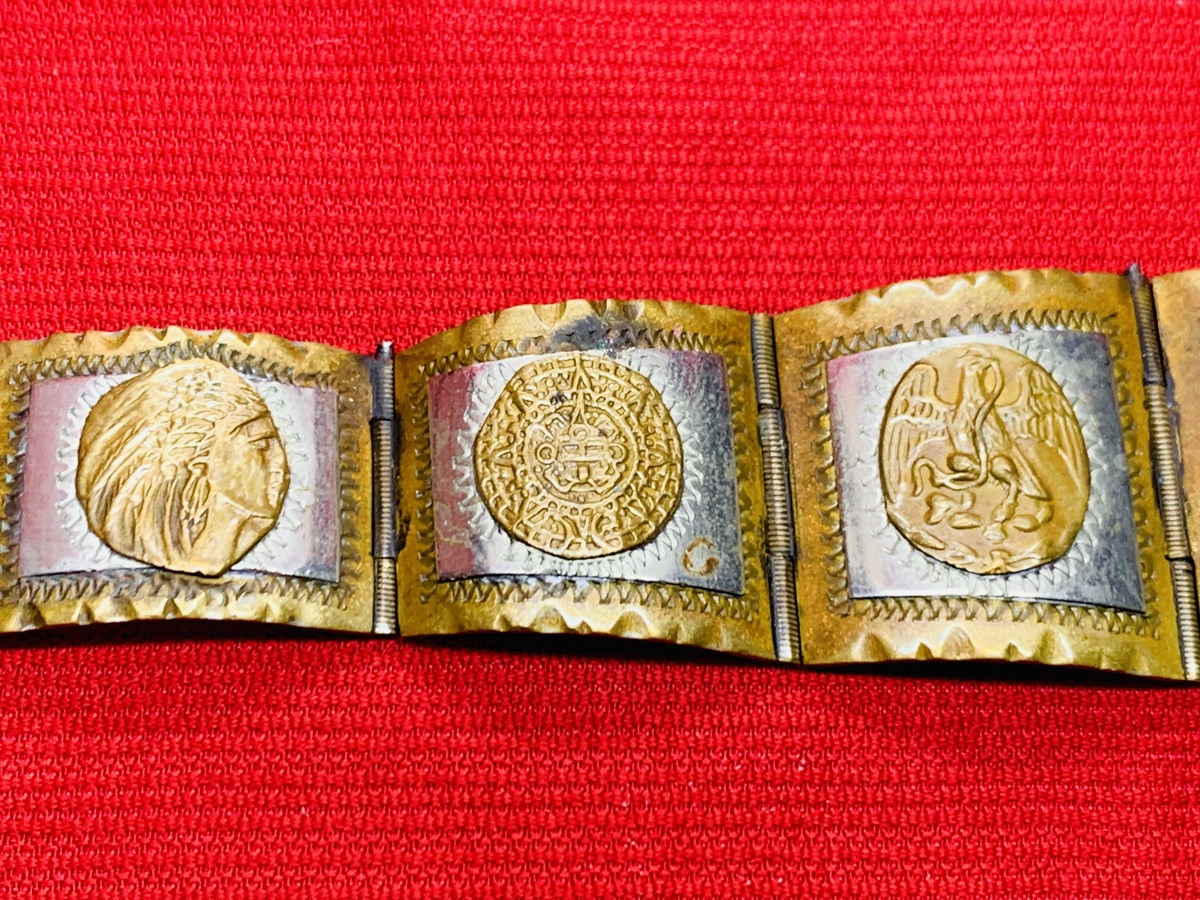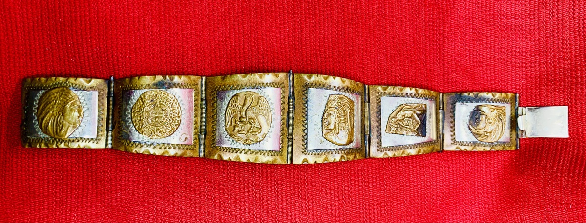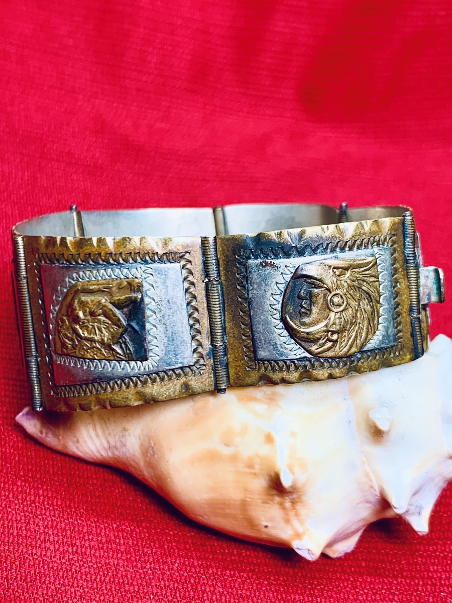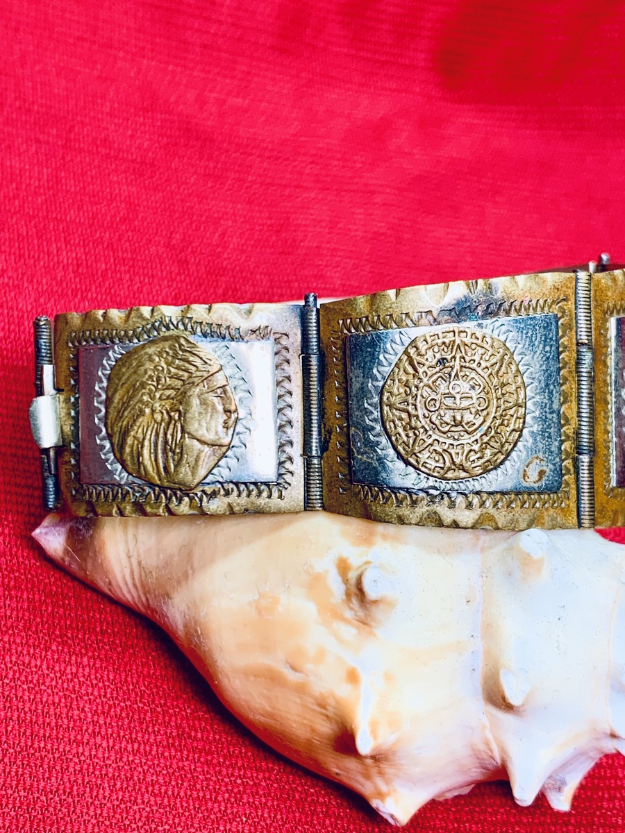1940's Vintage Taxco 2-Tone Sterling Silver Panel Bracelet w/Aztec Mayan Figures