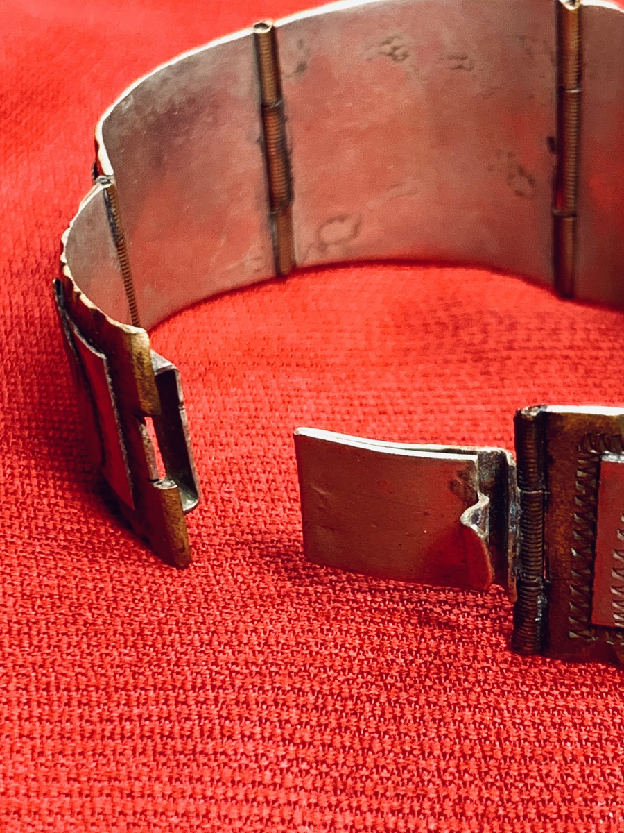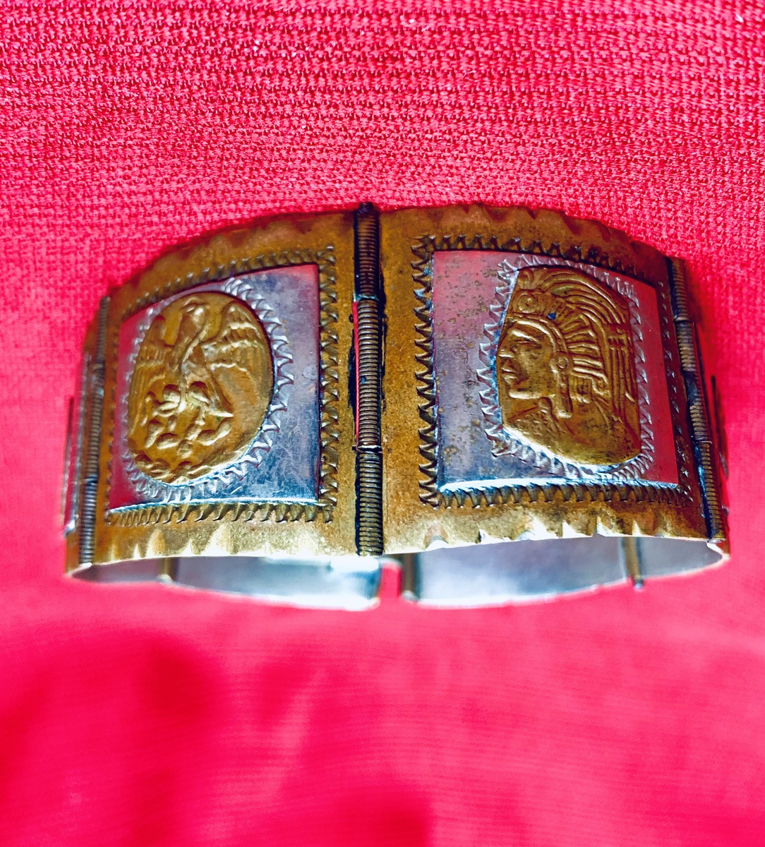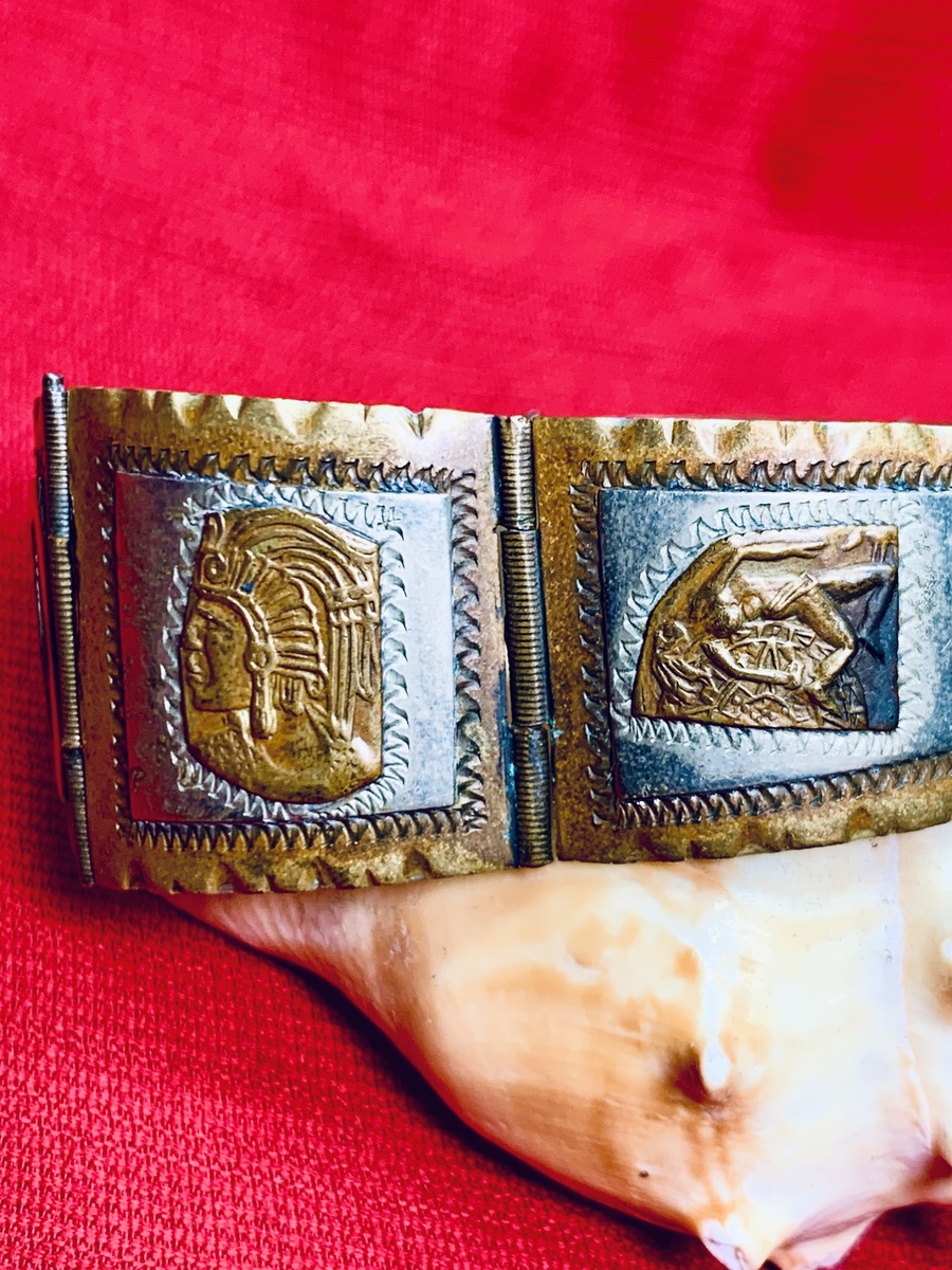 1940's Vintage Taxco 2-Tone Sterling Silver Panel Bracelet w/Aztec Mayan Figures