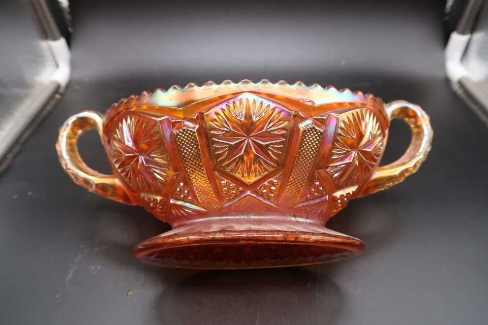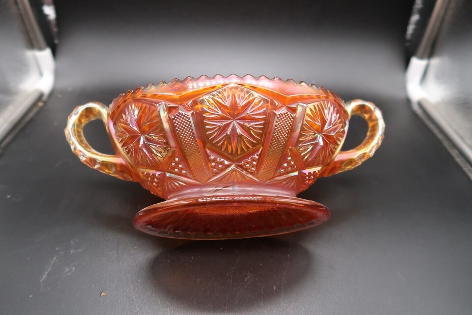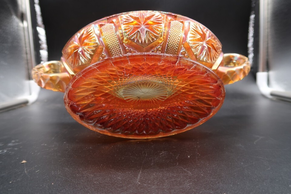 Antique Carnival Glass Imperial Star & File Glass Bowl Pedestal Two Handles