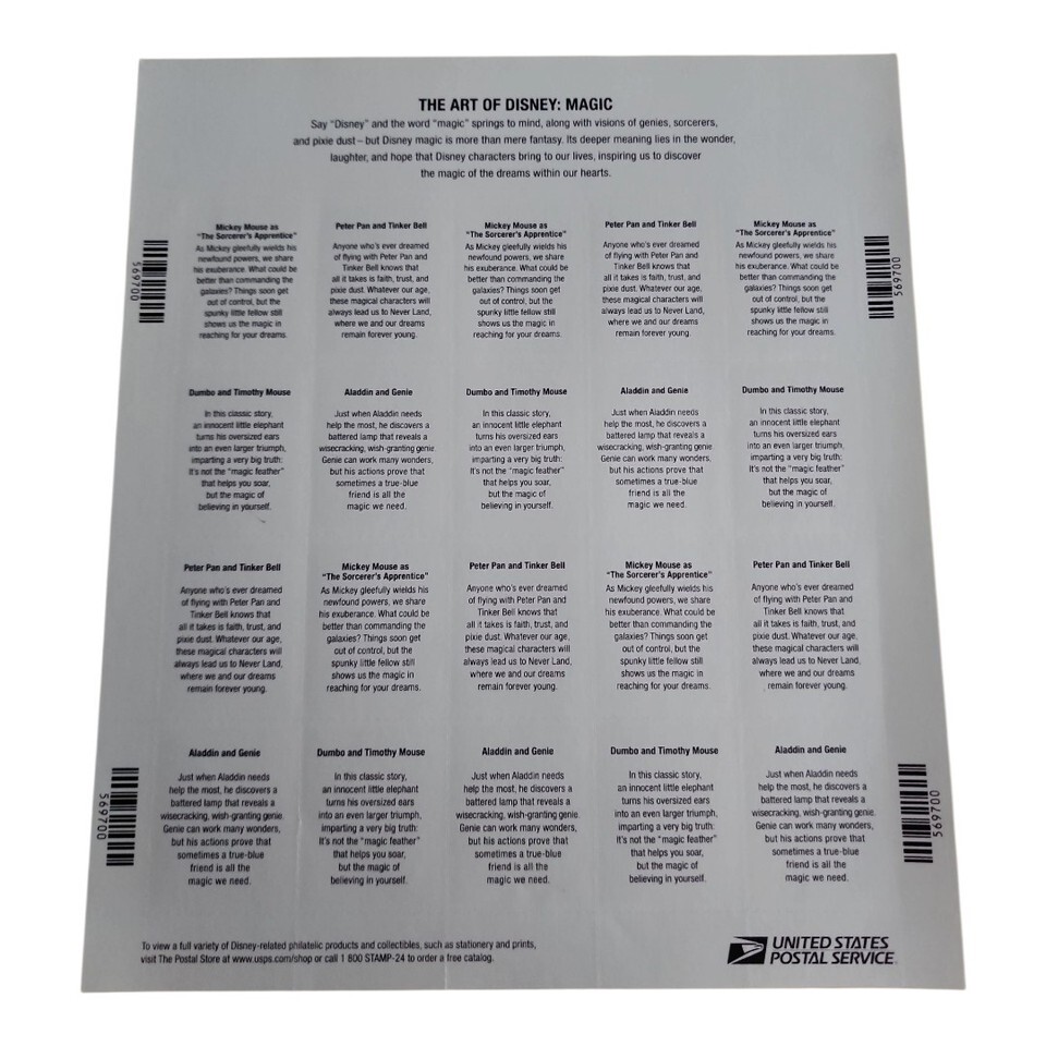 Unleash the enchantment of Disney with this complete sheet of "The Art of Disney Magic" postage stamps, a vibrant collection that brings beloved characters to life. Each stamp captures a magical moment, featuring iconic pairings like Mickey Mouse as the Sorcerer's Apprentice, Peter Pan and Tinker Bell, Dumbo and Timothy Mouse, and Aladdin and Genie. The stamps showcase the artistry and wonder that Disney is known for. Perfect for collectors, Disney enthusiasts, or anyone looking to add a touch of whimsy to their correspondence, these stamps are a miniature celebration of storytelling and friendship. Imagine using these to send heartfelt greetings, decorate scrapbook pages, or simply preserve as a cherished keepsake.