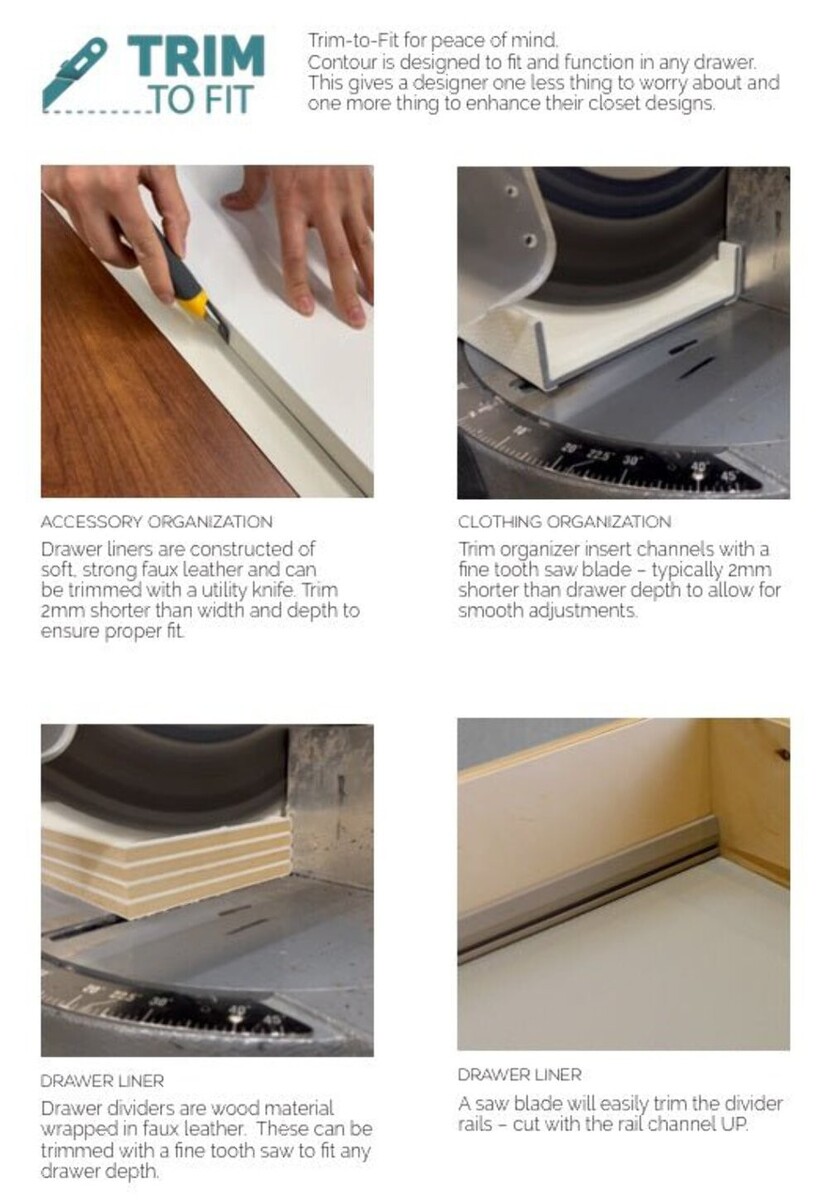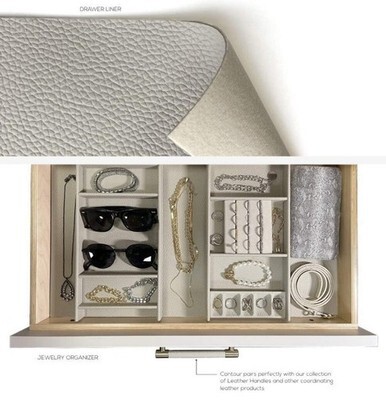 TAG Hardware Contour Drawer Liner ? Trim-to-Fit Base for Contour Configurable Drawer Organization System ? Soft Faux Leather with Self-Adhesive Tape The TAG Hardware Contour Drawer Liner is the essential base for the Contour Configurable Drawer Organization System, offering a luxurious faux leather that enhances the aesthetics and functionality of any drawer. Designed to be trimmed to fit, this liner ensures a perfect, edge-to-edge installation, maximizing drawer space while providing a soft, protective surface for clothing, jewelry, accessories, and personal items. Equipped with pre-applied double-sided tape, the Contour Drawer Liner securely adheres to the drawer bottom, preventing shifting or movement. Whether used alone or with Contour dividers, inserts, and clothing organizers, this liner brings a high-end look and feel to any storage space. Perfect for closet designers, professional organizers, and homeowners, the Contour Drawer Liner transforms ordinary drawers into premium, custom storage solutions with a refined, elegant touch. Key Features: Essential Base for Contour Organizers ? Designed for use with Contour dividers, creating a soft and luxurious foundation. Trim-to-Fit Installation ? Easily cut to match the exact size of your drawer bottom for a seamless fit. Premium Faux Leather ? Elegant, soft-touch material enhances the look and feel of your drawers. Self-Adhesive Design ? Includes pre-applied double-sided tape for secure, non-slip placement. Enhances Drawer Aesthetics Functionality ? Provides a high-end finish while protecting delicate items. Perfect for Closets Vanities ? Ideal for organizing jewelry, clothing, accessories, and more. Recommended Uses: ? Base for Contour Configurable Drawer Organization System? Luxury Closet Wardrobe Drawer Lining? Jewelry Watch Storage? Sunglasses Eyewear Protection? Tie Belt Organization? Clothing Lingerie Drawer Enhancement? Boutique Retail Display Specifications: Trim-to-Fit Sizes: Maximum Width: 610mm (24") x 915mm (36") Maximum Depth: 406mm (16") x 508mm (20") Materials: Premium Faux Leather ? Soft, durable, and easy to clean Pre-Applied Double-Sided Adhesive Tape ? Ensures a secure, non-slip fit Color Options: Three refined tones to match any closet aesthetic Why Choose the TAG Hardware Contour System? ?? Edge-to-Edge Trim-to-Fit Installation for a perfect fit in any drawer.?? High-end faux leather finish for a premium, dust-free, and easy-to-clean surface.?? Fully modular and adaptable ? Adjust dividers, trays, and compartments to suit your needs.?? Perfect for closet professionals, retailers, and homeowners looking for luxurious drawer organization. Upgrade Your Storage ? Shop TAG Hardware Contour Today!