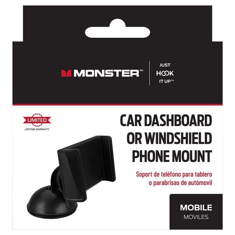 Introducing the Monster Just Hook It Up Car Dashboard or Windshield Phone Mount-engineered with high-quality materials for industry-leading performance. This versatile mount easily attaches to your car dashboard, windshield, or any flat surface, securely holding your phone, GPS, or small devices (2.4 - 3.5 inches). The adjustable cradle ensures a perfect viewing angle, enhanced by a full 360 deg. rotation capability. With its strong adhesive silicon suction mount, your device stays firmly in place. Trusted for its great components, this Monster accessory provides a reliable, easy setup to keep your essentials within reach. Includes cell phone mount and product manual.