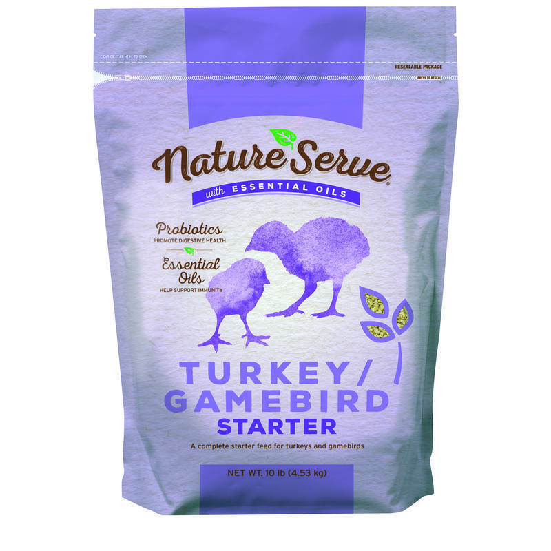 NatureServe Turkey/Gamebird Starter with essential oils is a non-medicated feed that offers complete nutrition to meet the demands of healthy, growing turkeys and gamebirds. Prepared as a crumble for balanced nutrition in every bite with no need for supplementation. NatureServe Turkey/Gamebird Starter is specially formulated with essential oils and probiotics to help with immunity and digestive health. It is also fortified with all the vitamins, enzymes and minerals needed for healthy growth, strong bones and sound development.