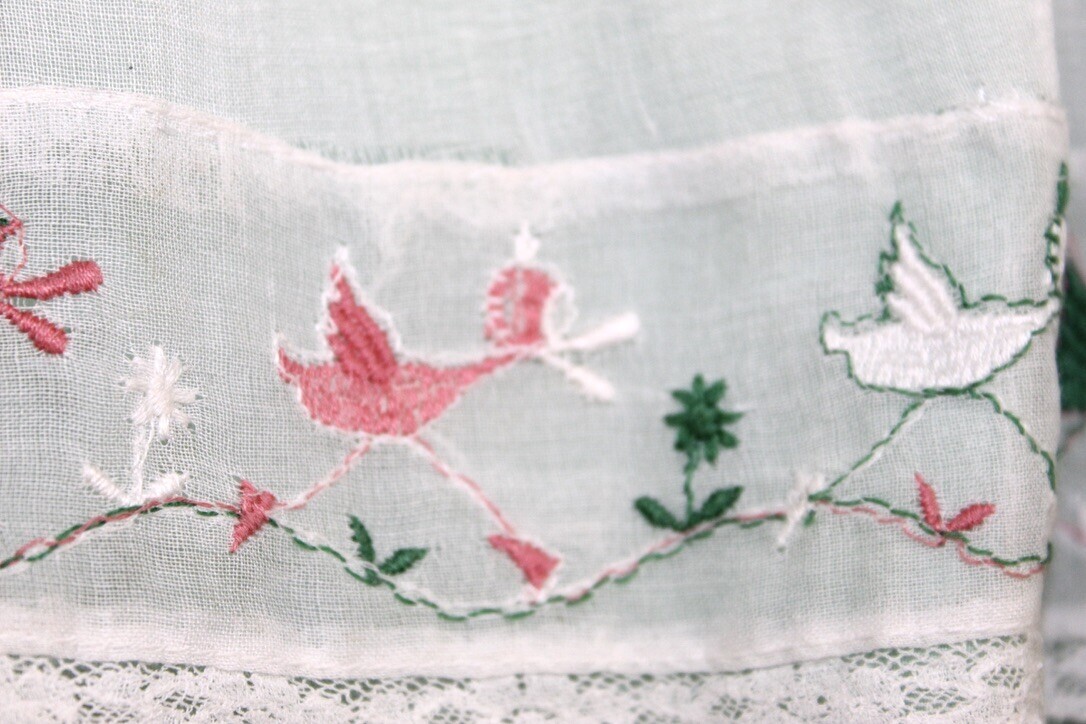 Green cotton base, attached white organdy pinafore, embroidered/trimmed ducks motif, missing original belt, Prim n? Pretty label