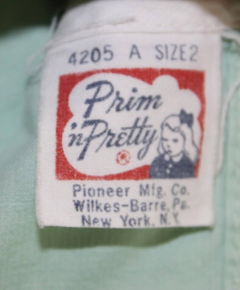 Prim n? Pretty was a midcentury childrenswear label that specialized in playful and practical designs. Pioneer-style dresses with pinafores and animal motifs were highly popular in the 1950s?60s, often purchased for parties, portraits, or special occasions. Today, these pieces are treasured by collectors, valued as heirloom keepsakes, and even used as props in photography and period film.