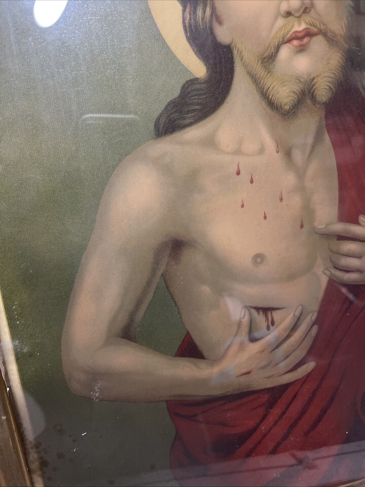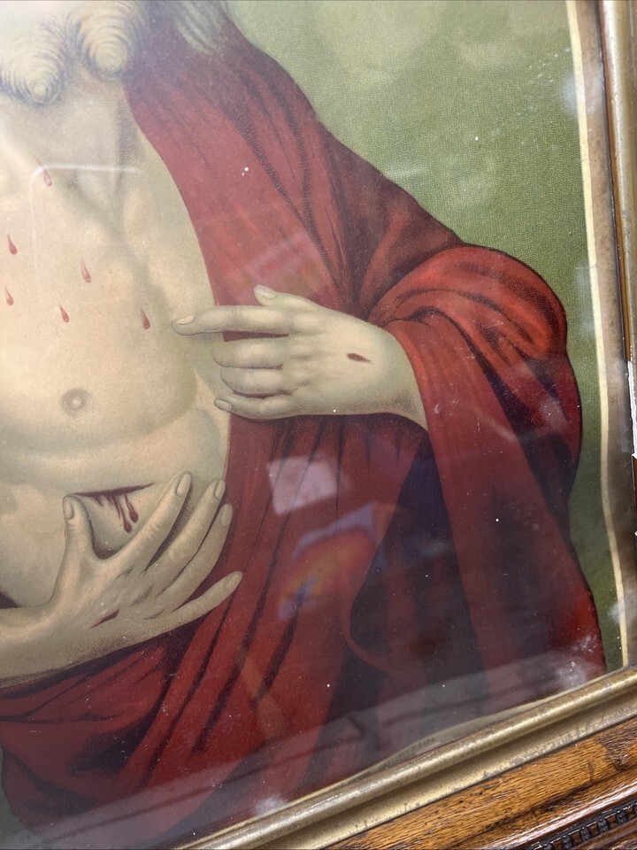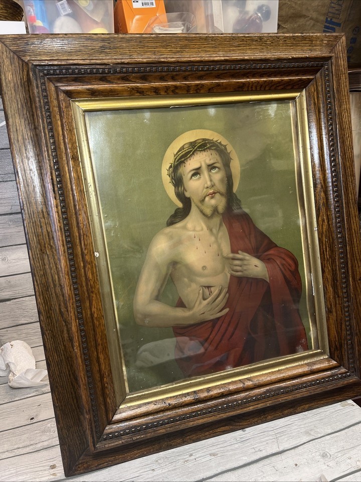 Vintage Chambers Sacred Heart of Jesus Print Wooden Frame Catholic Art MCM 29x25