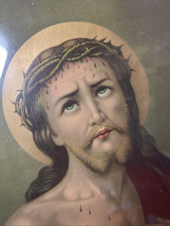This vintage Chambers Sacred Heart of Jesus print in a wooden frame is a licensed reprint from 1941. The medium-sized artwork features a realistic portrayal of Christ, making it a perfect addition to any religious or Christian-themed art collection. The vintage style and lithography production technique add to the timeless appeal of this piece, which measures 29 inches in height and 25 inches in width. Perfect for those who appreciate classic Catholic art and portraiture from the mid-20th century.