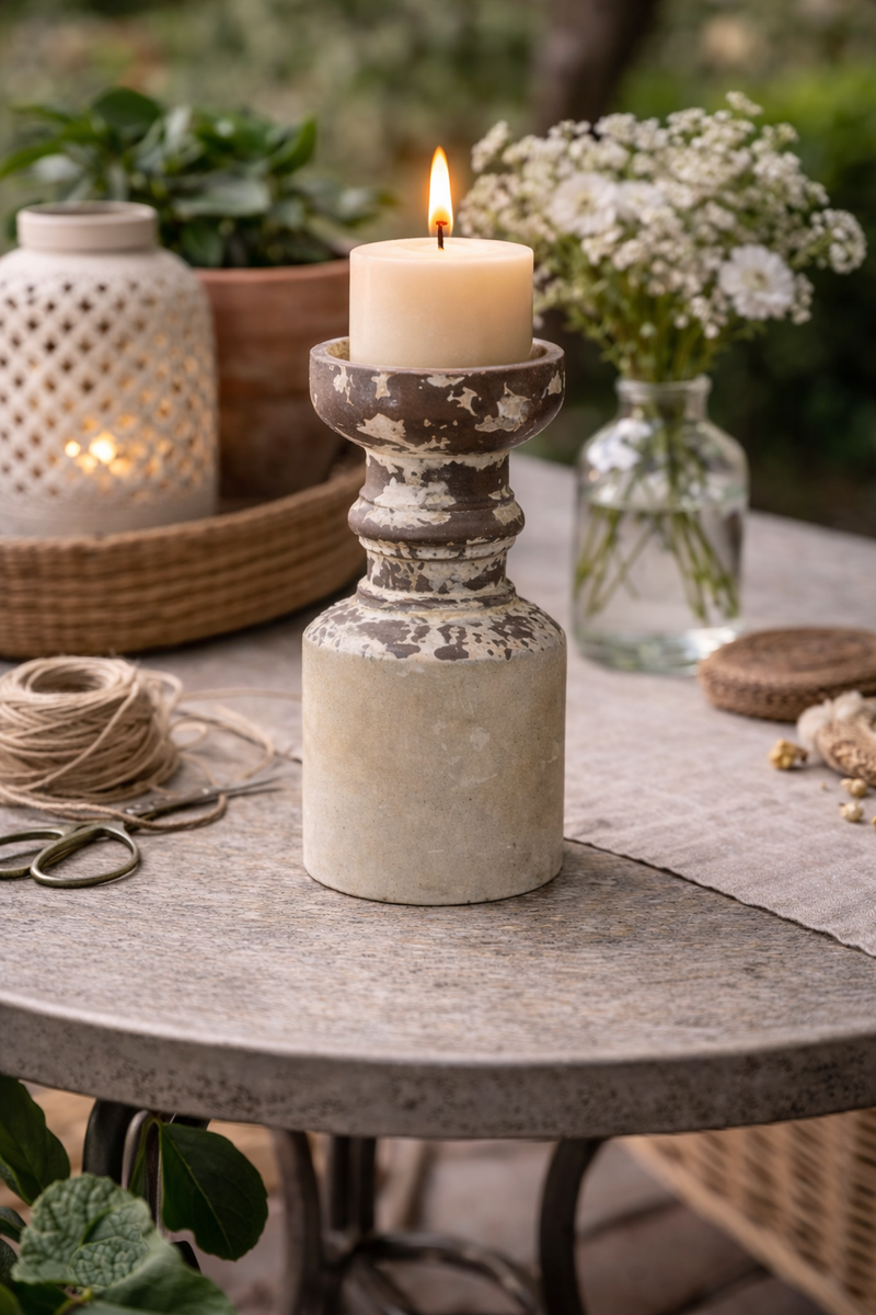 Designed in a graceful tapered shape, this candle holder blends farmhouse authenticity with understated elegance — perfect for accenting mantels, dining tables, or cozy corners with inviting candlelight.