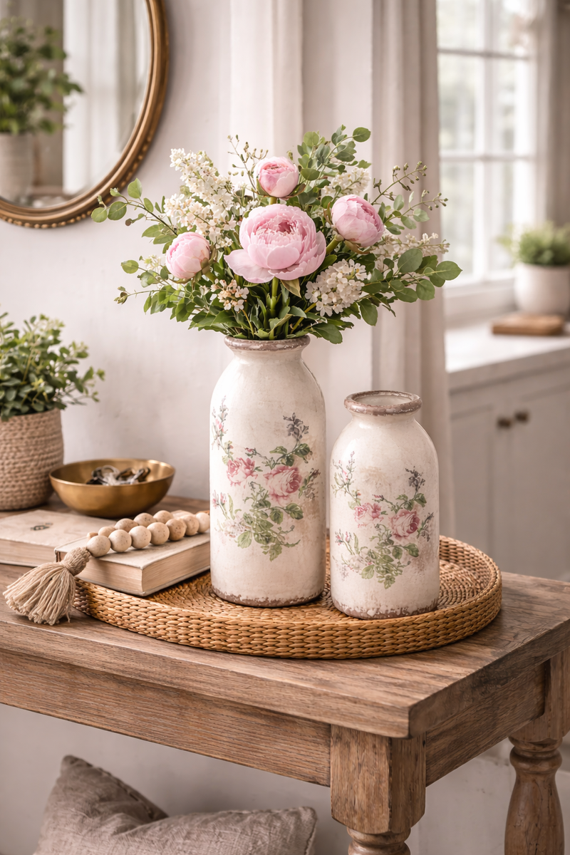 Graceful and full of old-world romance, this rustic floral vase is a lovely way to infuse your home with countryside charm and vintage elegance.