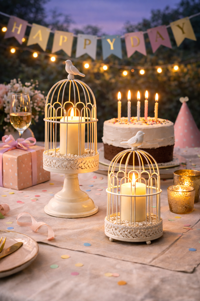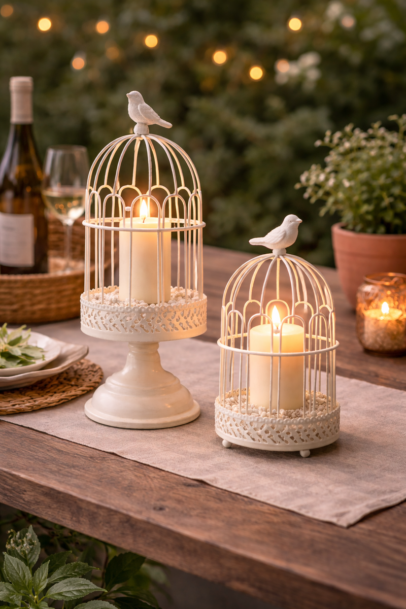 Add a touch of vintage charm and romantic elegance to your dรฉcor with these white iron bird cage candle holders. Beautifully crafted from sturdy iron and finished in classic white, each piece features an intricate openwork design that allows candlelight to glow softly through, creating a warm and inviting atmosphere.