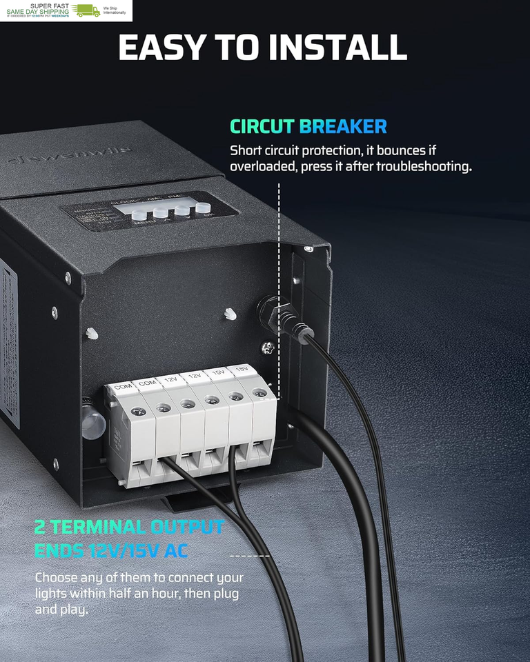 [Memory Function Circuit Protection] The landscape lighting transformer features memory function retains previous settings after power loss; short circuit protection ensures reliable and safe performance, automatically cuts off the output to protect the connected lights from damage