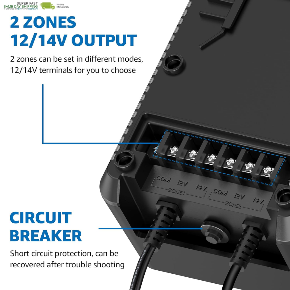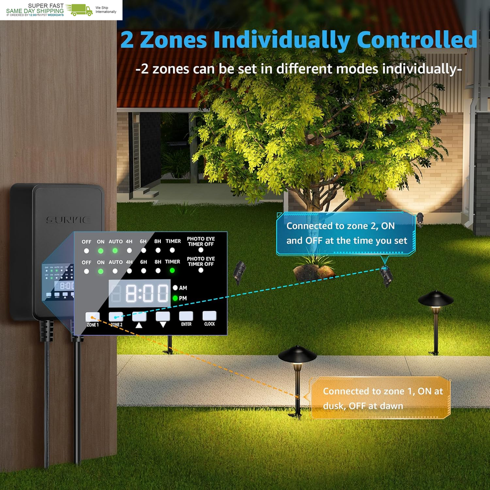 2 ZONES INDIVIDUALLY CONTROLLED - Designed with 2 individually controlled terminal output, your low voltage landscape lights connected to zone 1 and zone 2 can be set to different modes. You can set the mode easily for each zone just by pressing the "ZONE 1" or "ZONE 2" button. The total power of zone 1 and zone 2 should not exceed the 80% of the rated power of the transformer.