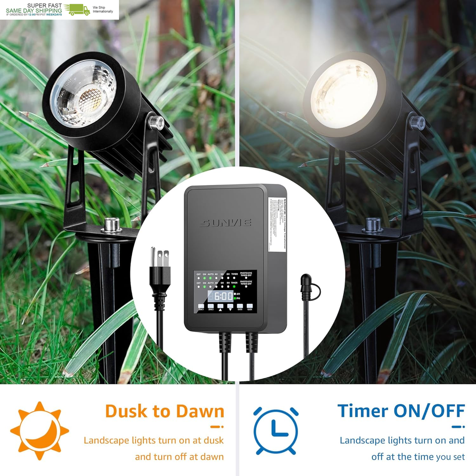 5 SETTING MODES - The landscape transformer is designed with 5 modes, including MANUAL ON/OFF mode (always on/off), AUTO ON/OFF mode (on at dusk and off at dawn), COUNTDOWN mode (on at dusk and off 4/6/8 hrs later), TIMER mode (on/off at the time you set), PHOTOCELL ON TIMER OFF mode (on at dusk and off at the time you set), enough to meet any of your needs and maximize energy savings.