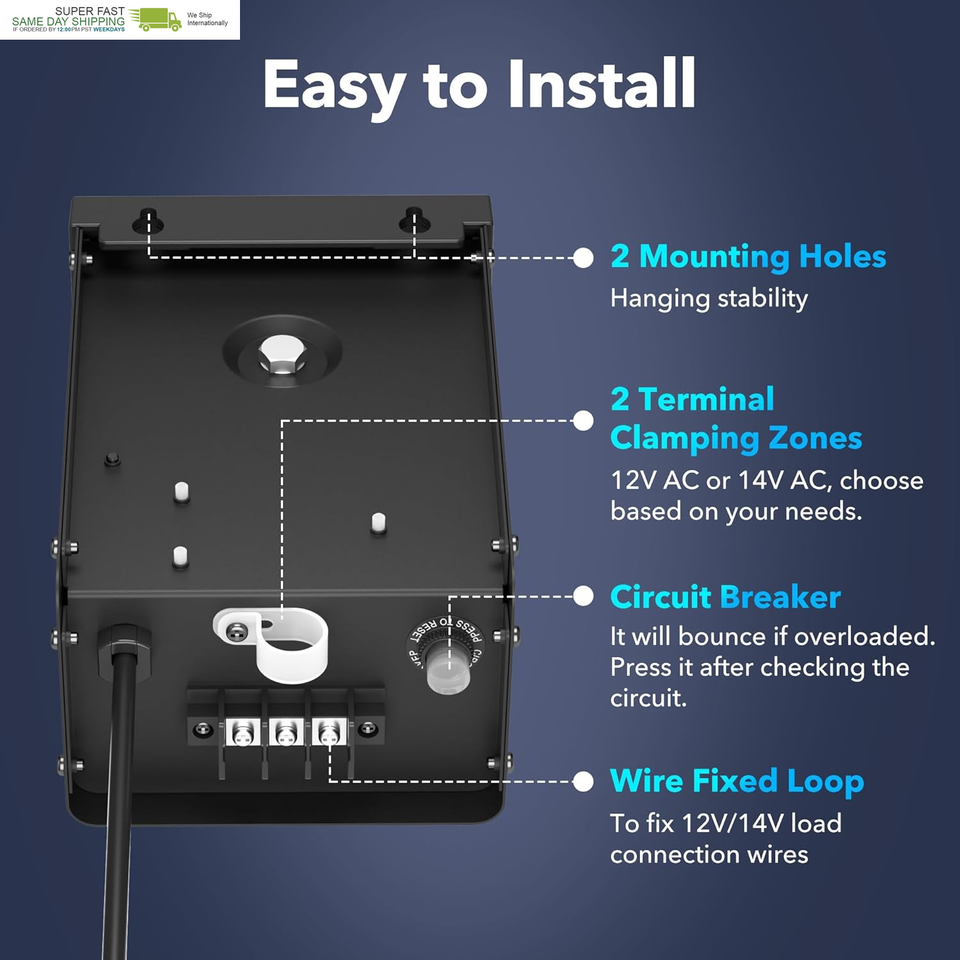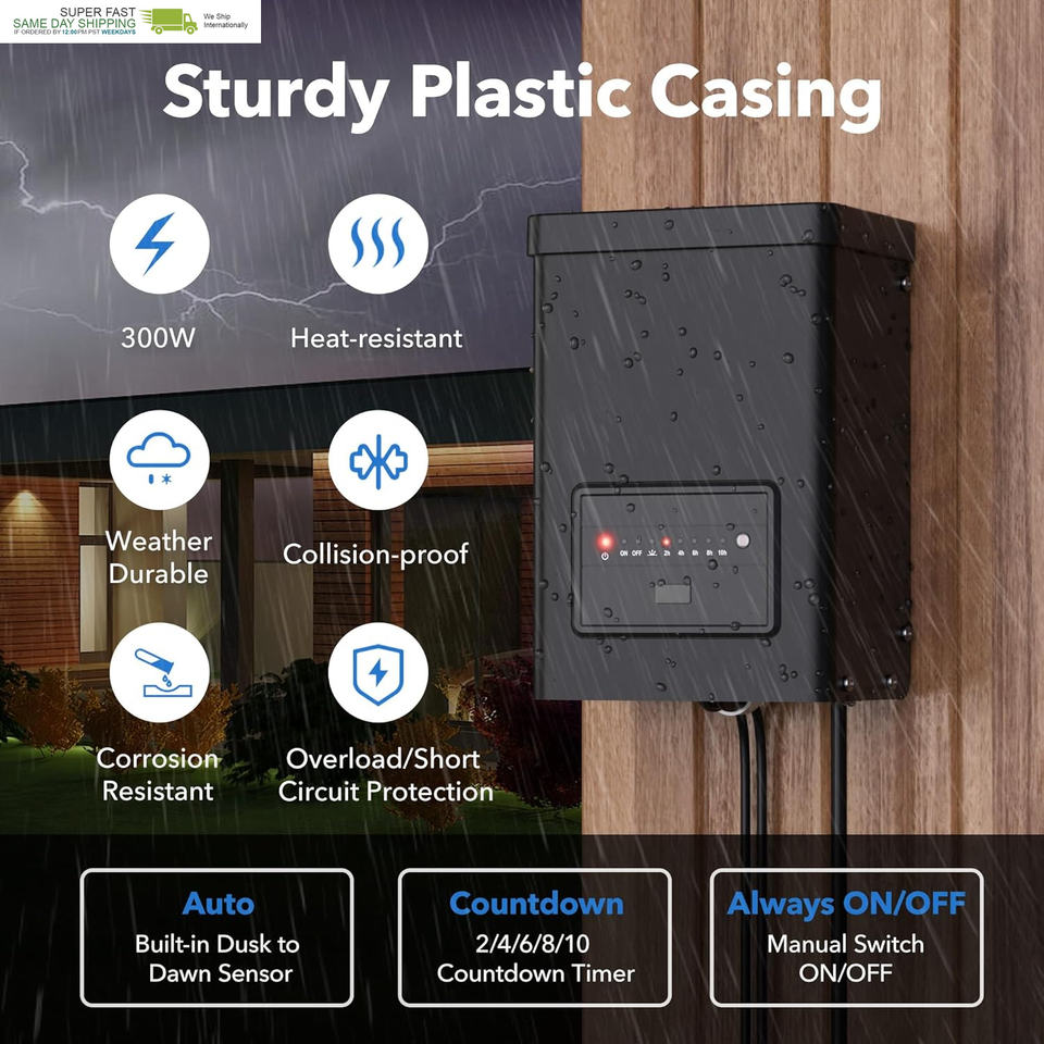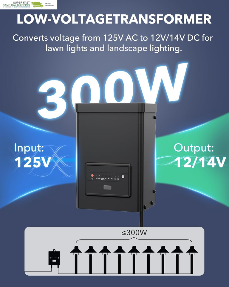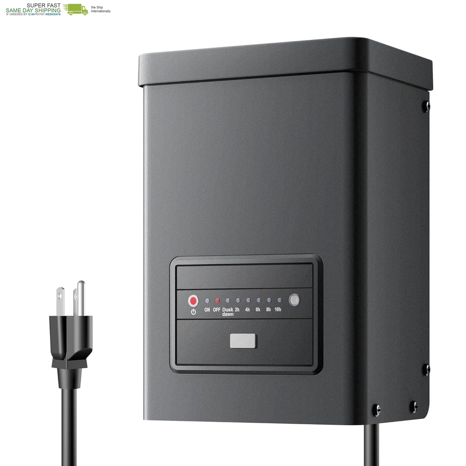 ?Durable Waterproof with Easy Installation?This 300W Low Voltage Landscape Transformer is built with a robust metal housing coated with a waterproof layer, offering superior protection against harsh weather, corrosion, and UV damage for long-lasting performance. Equipped with a countdown timer and photocell sensor for automatic operation, it ensures efficient power management. The built-in mounting holes and 5-foot power cord allow for easy installation on both indoor and outdoor walls. For optimal performance, install at least 12 inches above the ground. Enjoy reliable lighting for years to come.