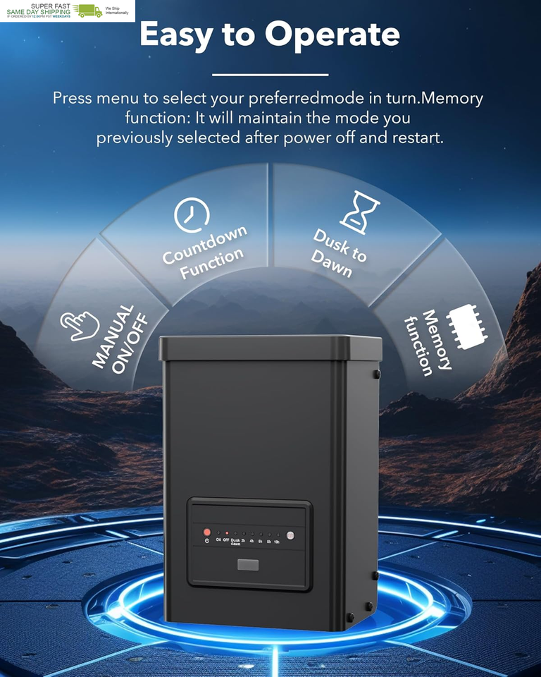 ?Multiple Modes?The outdoor lighting transformer offers 3 modes, including manual on/off, automatic on/off (dusk to dawn), and automatic on (turns on at sunset) with off after 2/4/6/8/10 hours. Select any preferred mode using the zone buttons.