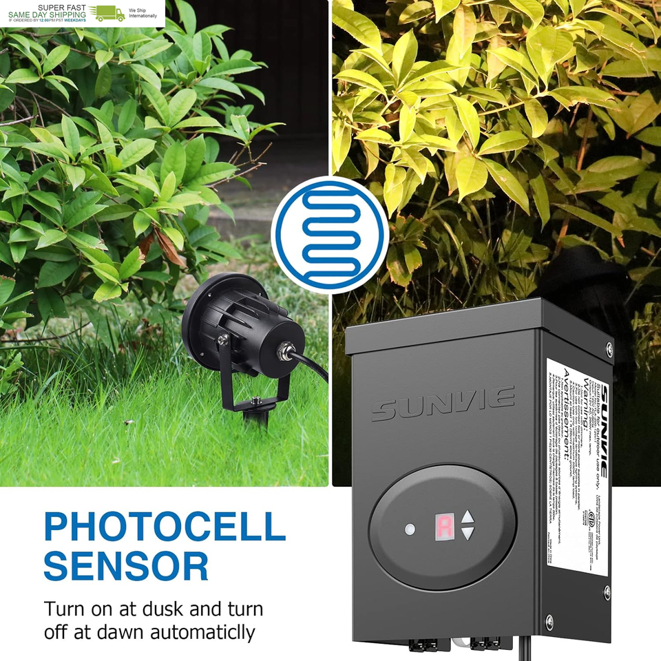 ?Built-in Timer and Photocell Sensor Device? SUNVIE low voltage landscape transformer has a built-in timing device and photocell sensor. When set to ?AUTO? mode, the landscape lights will automatically turn on at dusk and turn off at dawn; When set the ?Countdown Timing? mode, the landscape lights will automatically turn on at dusk, and turn off 1/2/3/4/5/6/7/8/9 hours later.