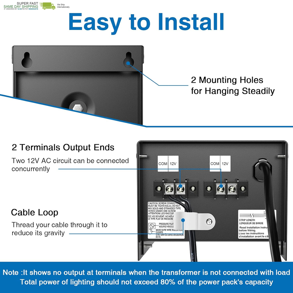 ?Easy to Operate and Install? Press the "??" button to set the ?Always On?/?AUTO?/?Countdown Timer? mode, easy to operate. Connect the cable of low voltage landscape lights to the output terminal of transformer (2 sets 12V AC terminals ). Two hanging holes on the back, which can be directly mounted on the outdoor wall. 3.3 FT SJTW 18AWG power cord, plug and play.