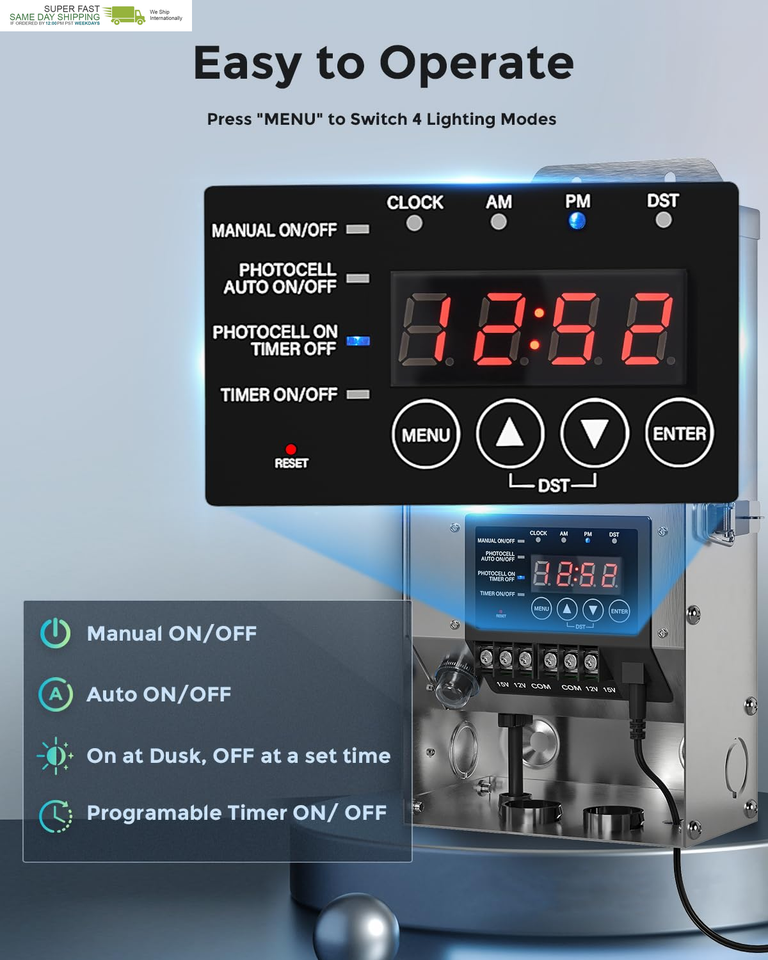 [Versatile Lighting Control] This landscape light transformer allows you to switch between Manual ON/OFF, Photocell Auto ON/OFF, Photocell ON/Timer OFF, and Programmable Timer ON/OFF modes; ideal for low voltage landscape lighting transformer setups that require customized lighting schedules and energy efficiency