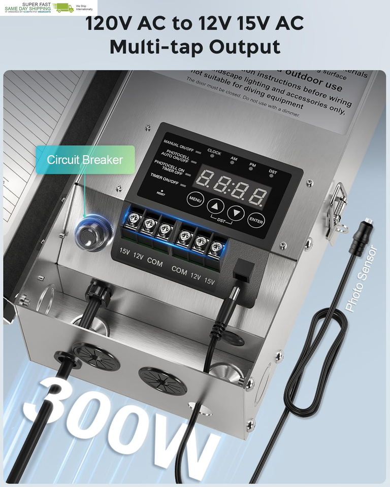 [Safe and Stable Power Conversion] This 300 watt low voltage transformer converts 120 V to 12 V AC/15 V AC with multi-tap outputs; includes an automatic circuit breaker to prevent overloads, ensuring your outdoor transformer landscape lighting remains protected and operates efficiently