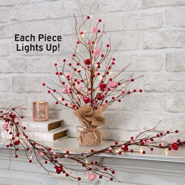 The Lighted Heart Table Tree is a delightful addition to any space, perfectly capturing the spirit of love and warmth. It features branches adorned with an array of pink and red artificial hearts and balls, wrapped in dazzling LED fairy lights that bring a soft, romantic glow to your room. Its flexible branches invite you to style them however you wish, adding a personal touch to your decor. With a sturdy burlap-wrapped base, this table tree offers both stability and durability, making it an ideal accent for your desk or shelf. Whether you're setting up for a festive occasion or simply enhancing your everyday environment, this unique decoration is sure to brighten your day and create an inviting atmosphere.
