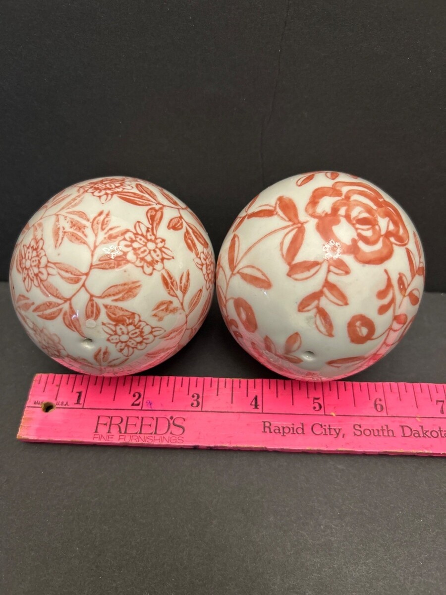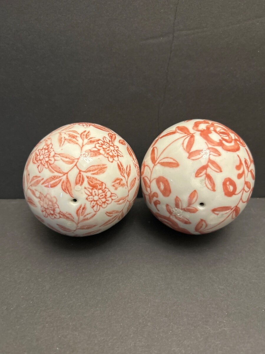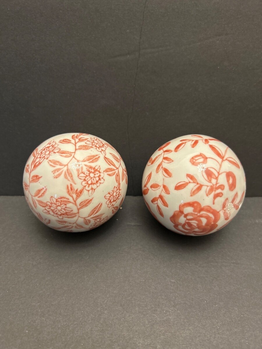 These charming ceramic carpet balls feature an intricate pinkish orange colored floral patterns on an off-white base. Their spherical design and hand painted pattern reminiscent of balls used in Victorian parlor games adds a touch of timeless elegance and make a lovely addition to any collection or decorating style.