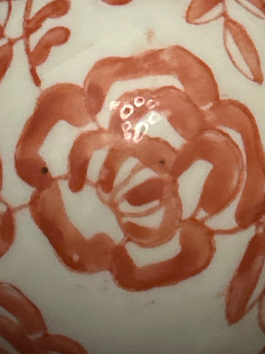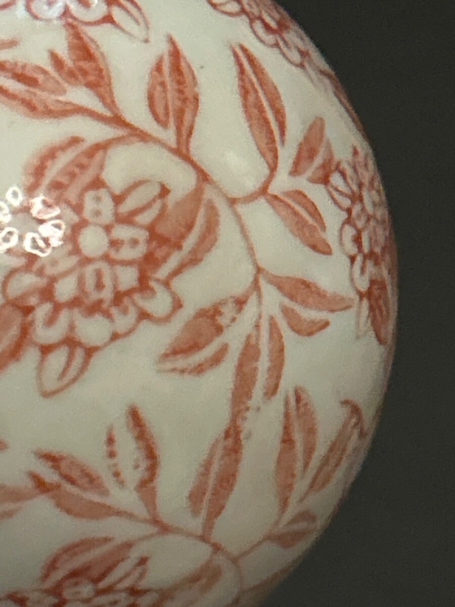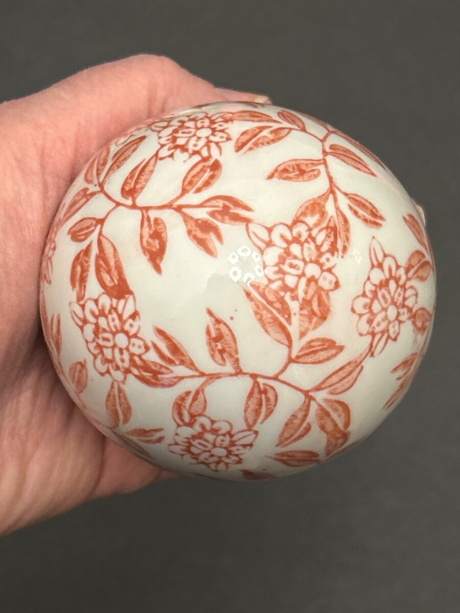 These charming ceramic carpet balls feature an intricate pinkish orange colored floral patterns on an off-white base. Their spherical design and hand painted pattern reminiscent of balls used in Victorian parlor games adds a touch of timeless elegance and make a lovely addition to any collection or decorating style.