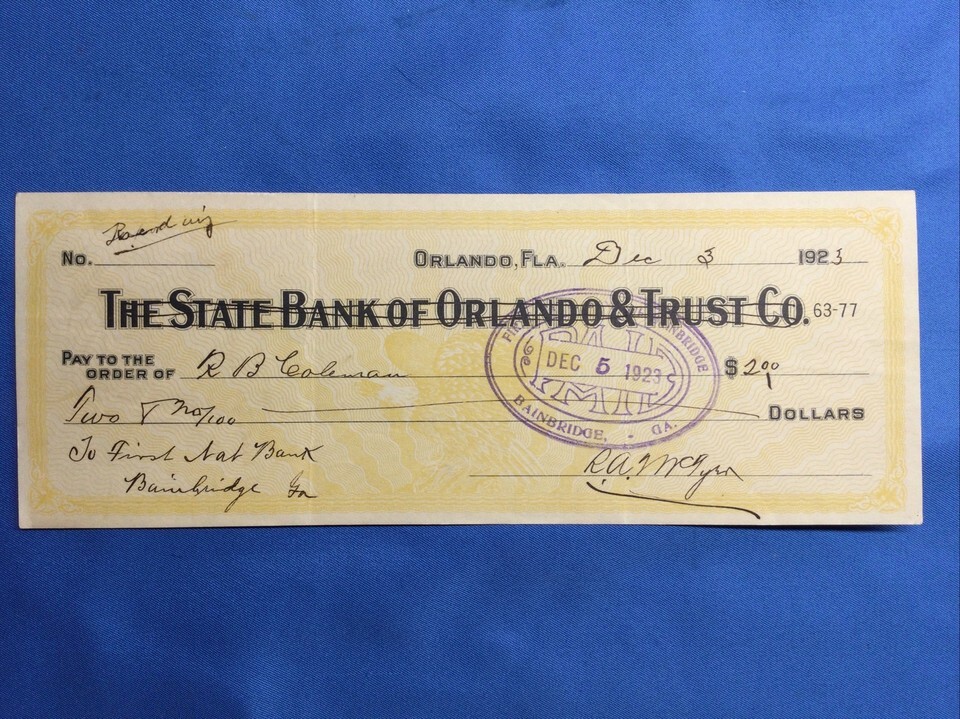 The State Bank of Orlando & Trust Co. Florida FL FLA 1923 Obsolete Check CASHED