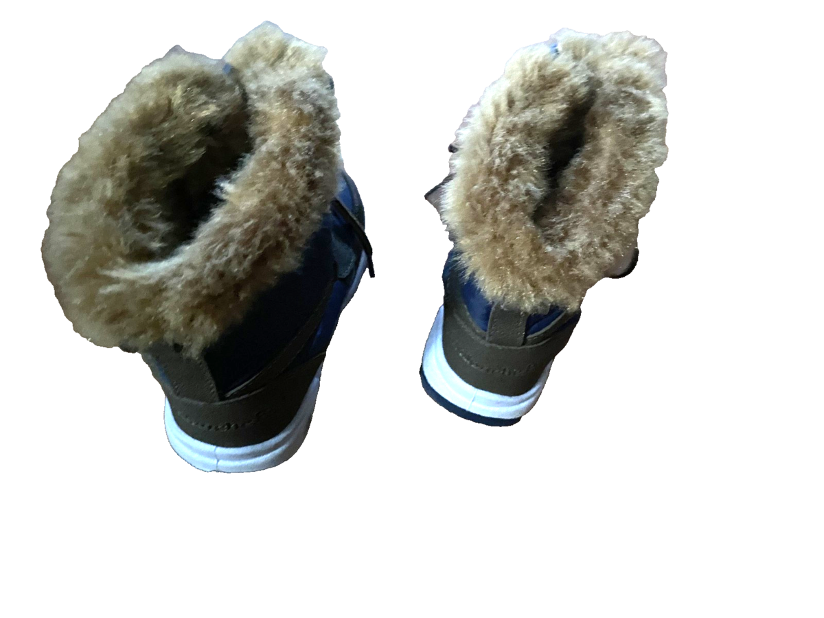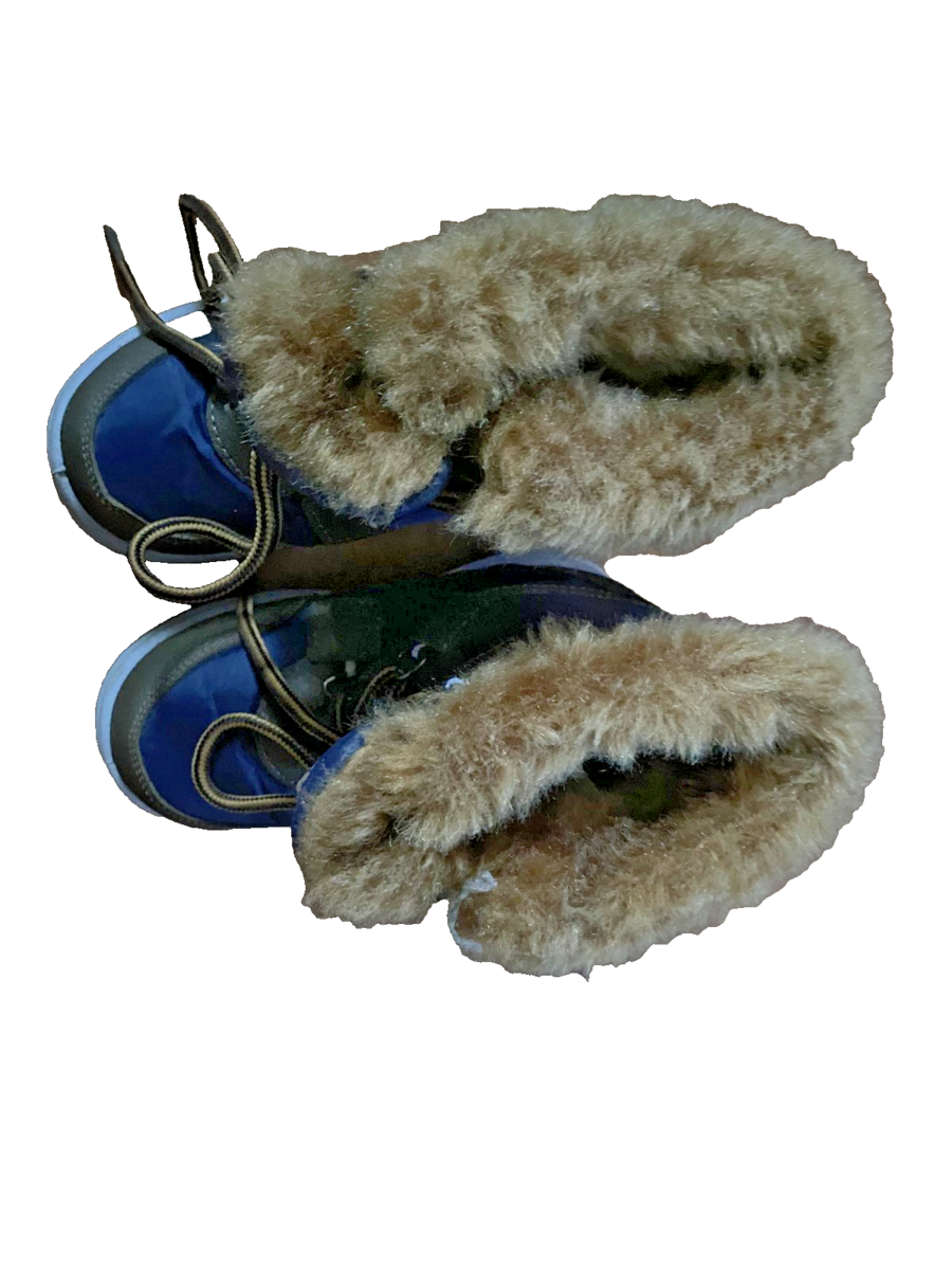 Little boy snow boots brown/blue with brown faux fur. Man-made materials. size 8.