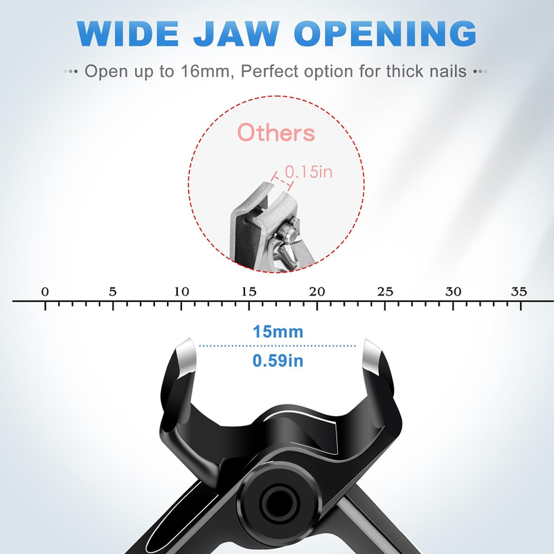 Wide Jaw Opening for Thick Nails - Large size toenail clippers could open cutting mouth so wide up to 15mm/0.59in, easier to trim thick fingernails or toenails than regular nail clippers. It is great for the elderly, men, women, adult, teen, and special for seniors with thick toenails. Please toggle the spring in the opposite direction first before using the nail clipper normally.