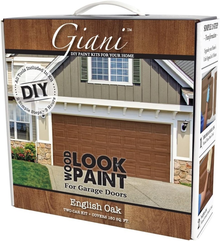 From cold, plain white or simple solid colors to the elegance and beauty of natural hardwoods, Wood Look Paint will help you upgrade your home?s curb appeal and paint your garage door to look like wood in a single morning or English Oak recreates the pith of the native British tree with it?s muted, but translucent variety of brown tones and fine, tightly spaced grain, and compliments a wide range of light to medium brick, siding and stucco Wood Look Paint Kit is a simple, two-step application that will transform smooth, embossed, flat or raised panel doors in just three hours. Each kit contains all necessary tools and covers 180 square feet of surface, which is the typical size of most two car garage for use on painted steel or wood garage doors of any color, there is no need to prime prior to applying Wood Look. Our unique system contains a Wood Tone Base Coat that will cover most existing colors in a single application, and our specially formulated Wood Grain Finish Coat that completes the wood look transformation.
